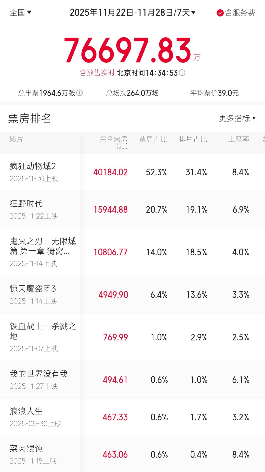 首先,我们来简单回顾一下刚刚过去的一周(11月22日-11月28日)。这个周期内,最引人注目的无疑是迪士尼动画大作《疯狂动物城2》的强势登陆。影片于11月26日上映,迅速点燃了市场热情,成为了当之无愧的票房焦点。根据专业版票房数据,该片首日票房近2.3亿元,打破多项纪录,其在青岛排片占比和上座率也均表现优异,显示出极强的观众号召力。