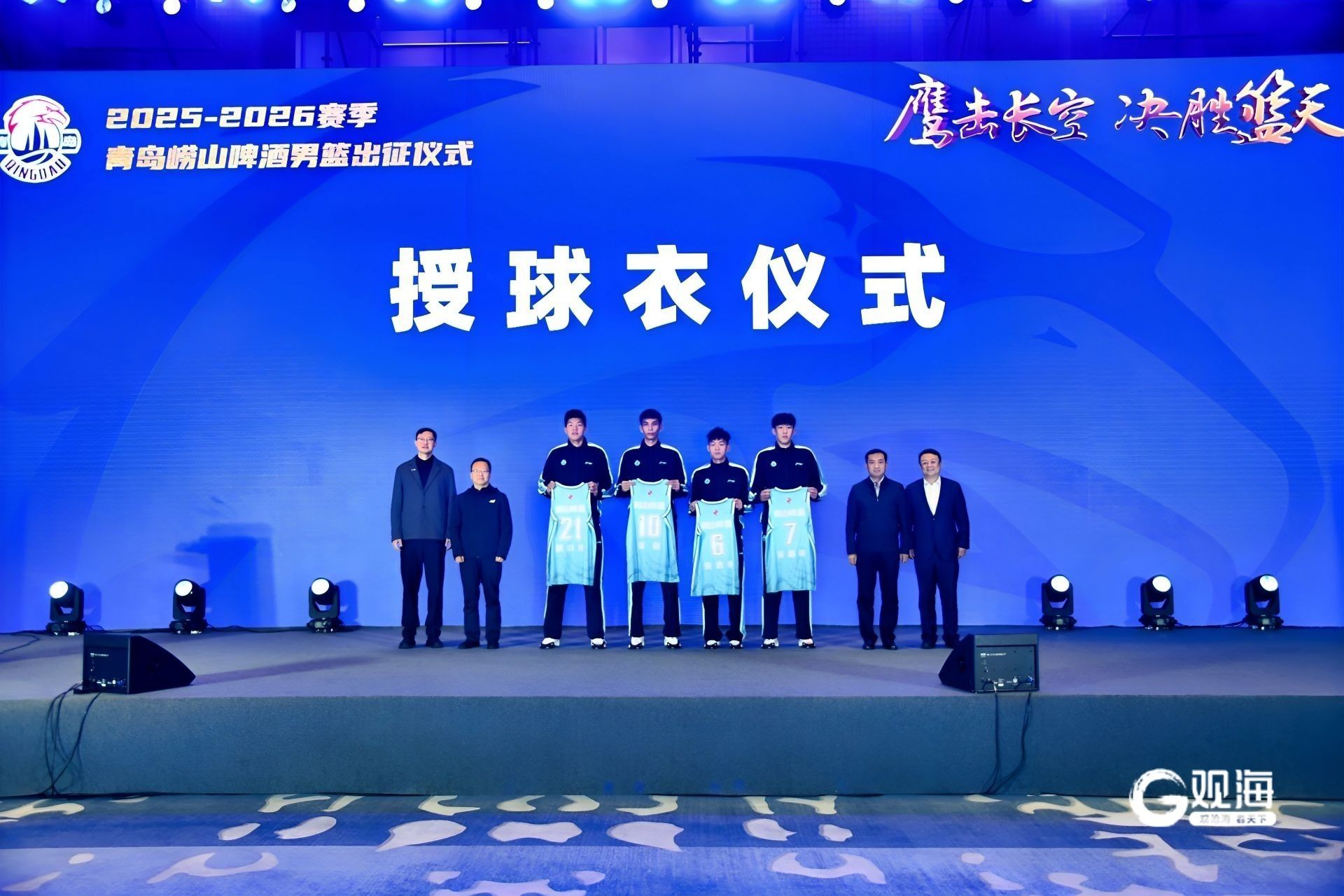 出征仪式上,青岛崂山啤酒男篮集体亮相,到场领导嘉宾为新入队球员颁发新赛季战袍。市政府副市长赵胜村宣布新赛季出征,并将球队队旗授予主教练刘维伟,青岛崂山啤酒男篮正式拉开新赛季战幕。