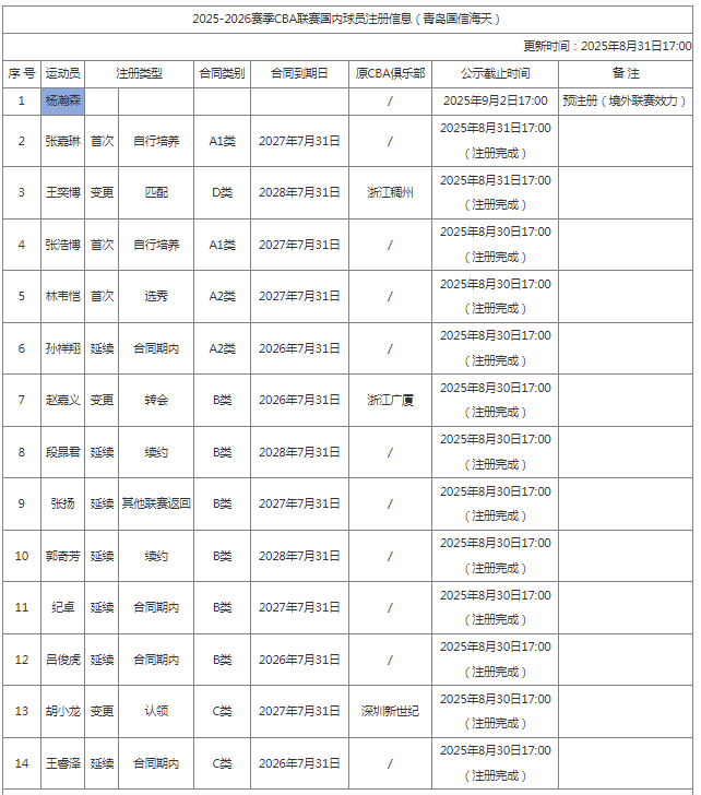 早在8月31日,2025-2026赛季CBA联赛国内球员注册截止,青岛崂山啤酒男篮完成了14名本土球员的注册工作,并与4名外援签约,新赛季的球队阵容敲定。