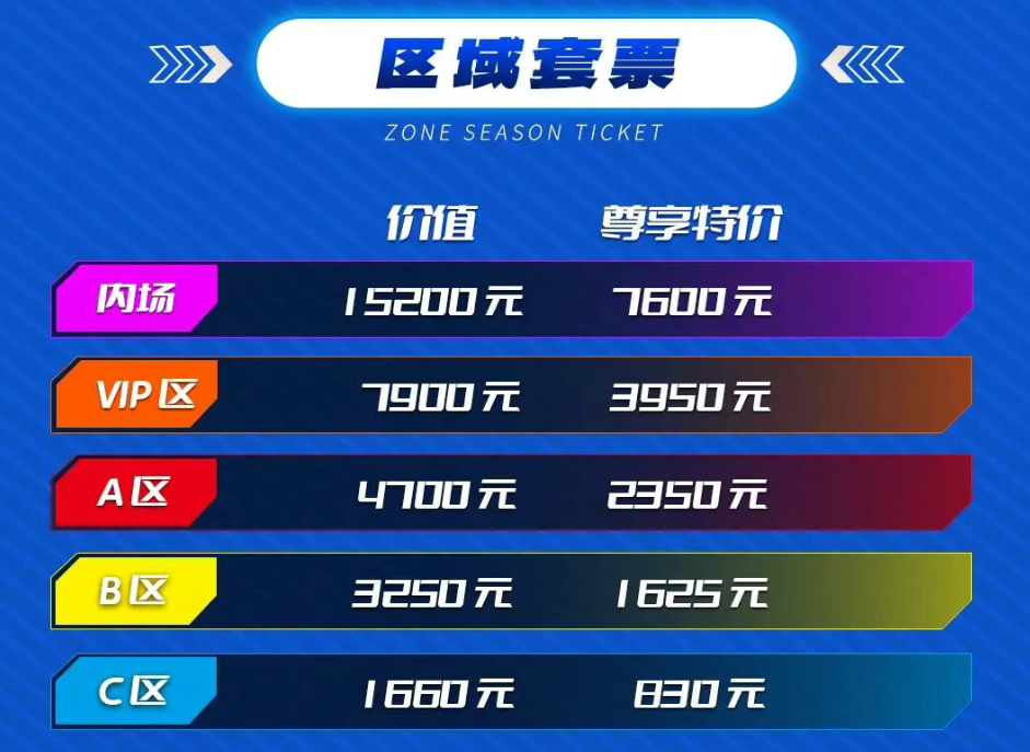 根据青岛国信海天篮球俱乐部发布的信息,本赛季青岛崂山啤酒男篮主场套票分为内场、VIP、A区、B区、C区五个区域,价格分别为7600元、3950元、2350元、1625元和830元;单场票分为重点场次和惠民场次,重点场次价格分别为1000元、500元、300元、200元、100元,惠民场次价格分别为600元、300元、200元、150元、80元。以上场次不包含2026年1月25日对阵广州龙狮、1月27日对阵浙江广厦和2月3日对阵广州龙狮的三场比赛。