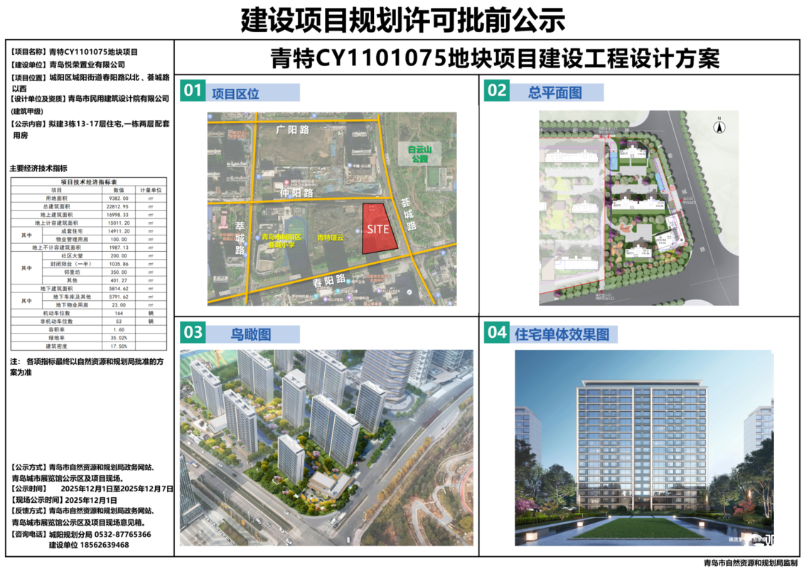 一同公示的青特CY1101075地块项目位于城阳区城阳街道春阳路以北、城路以西,由青岛悦荣置业有限公司负责建设。项目拟建3栋13-17层住宅、一栋两层配套用房。
