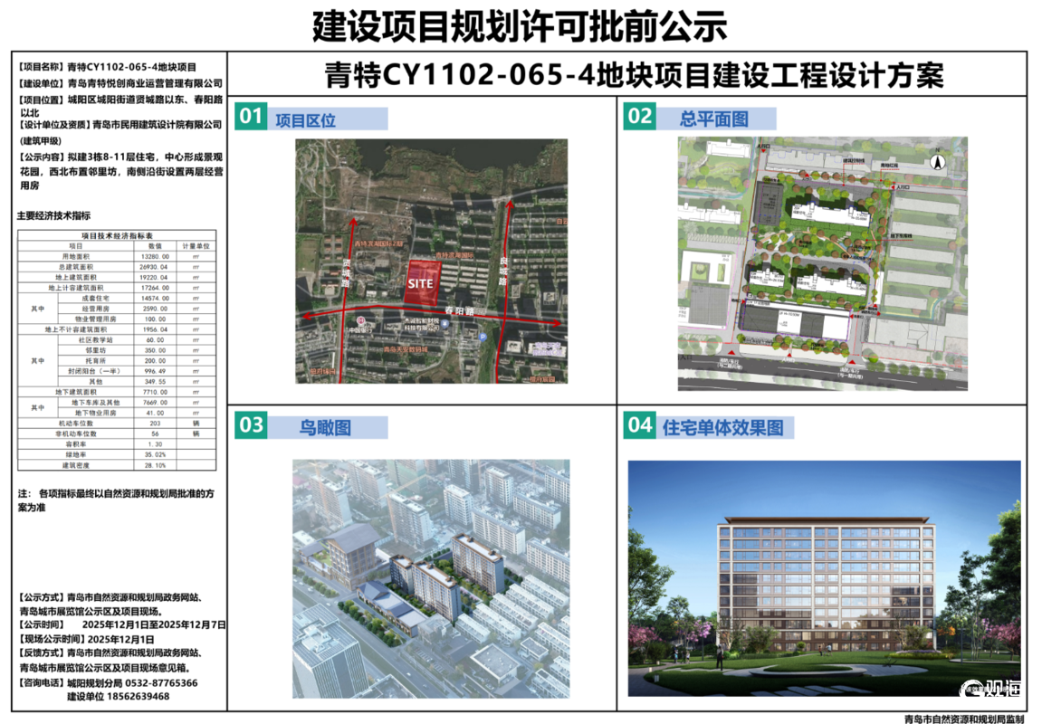 其中,青特CY1102-065-4地块项目位于城阳区城阳街道贤城路以东、春阳路以北,由青岛青特悦创商业运营管理有限公司负责建设。项目拟建3栋8-11层住宅,中心形成景观花园,西北布置邻里坊,南侧沿街设置两层经营用房。