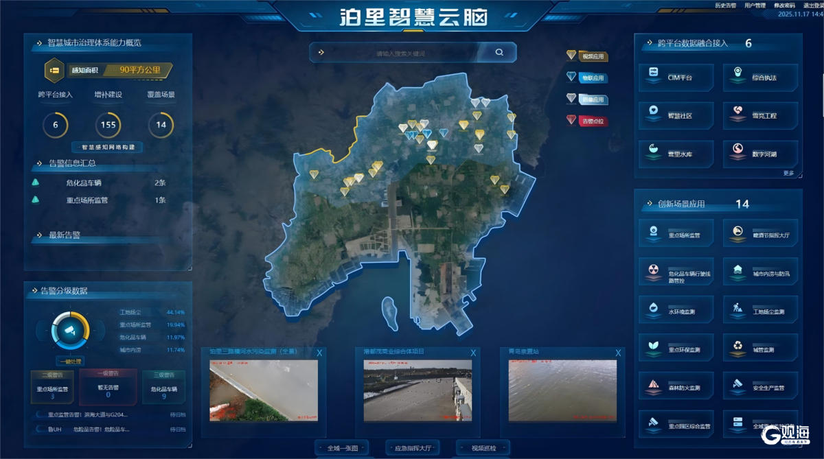 泊里镇整合公共视频、社会监控等共计200余路视频资源、物联设备等多元数据,统一接入智慧云脑平台,破解以往系统互不兼容、数据孤岛等难题。平台覆盖人口、地理、应急等全域信息,形成“一图通览”的治理资源调度体系。通过制定三级响应机制,普通事件1小时内处置,重大紧急事件5分钟内启动响应,2024年以来已高效处理安全防控、市容管理等事件6153起,跨部门协同效率提升80%。