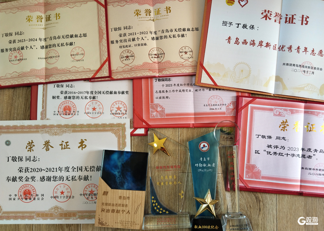 从“全国无偿献血奉献奖”到“青岛市无偿献血志愿服务突出贡献个人”,从“优秀青年志愿者”到“优秀红十字会志愿者”——一张张证书、一座座奖杯,不仅记录着他从普通献血者到“生命模范”的升华之路,也见证着一份平凡中的伟大。