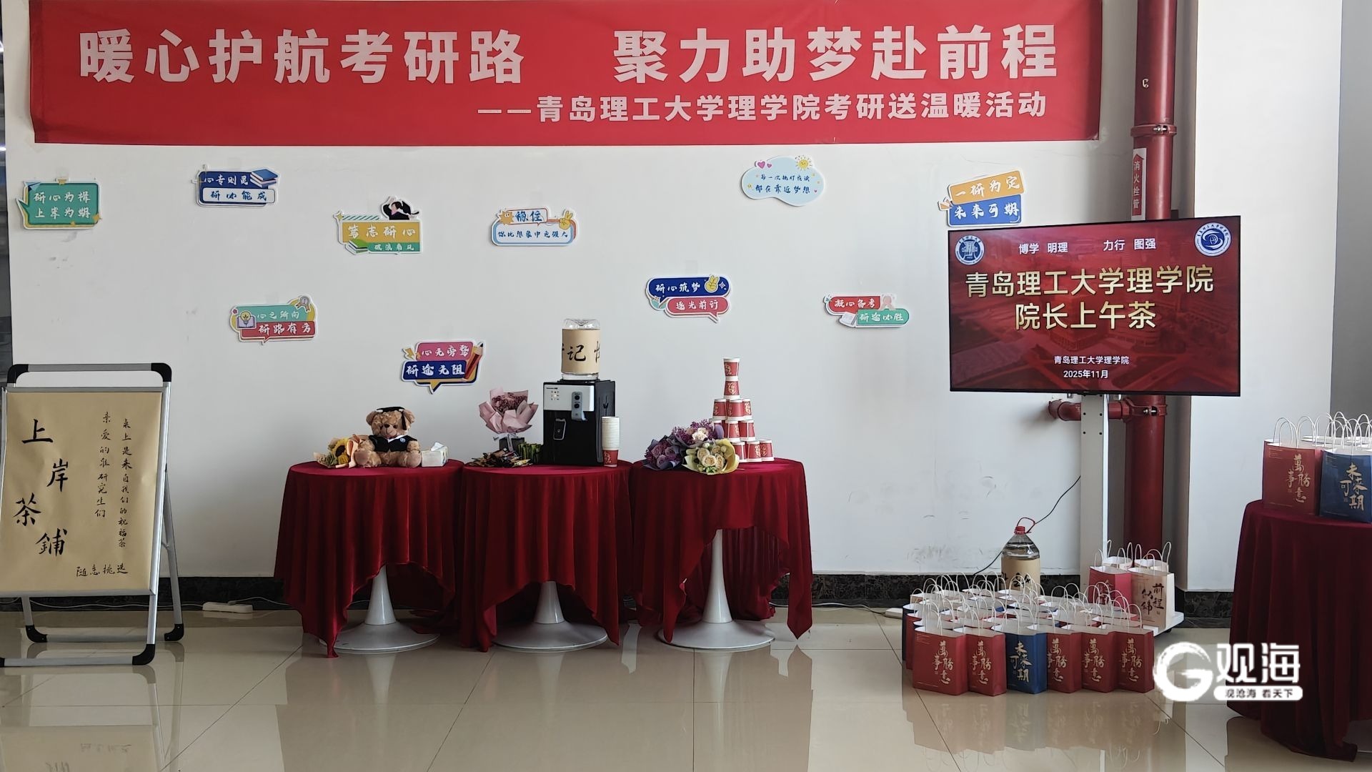 青岛日报社/观海新闻12月1日讯 “今年的‘上岸茶铺’不仅有热气腾腾的奶茶,还有考研冲刺‘大数据干果’,每天有‘小惊喜’,也有‘新知识’,真是暖心又提气!”在青岛理工大学理学院自习室门口,处于考研冲刺期的2022级学生宋利祥手捧“上岸茶”说。“上岸茶铺”是青岛理工大学理学院“助力考研”的品牌活动,每年考研冲刺期,学院都会在自习室门口支起茶铺,备好梳理肝气的玫瑰花茶、清肝明目的决明子茶、增强机体免疫力的茉莉花茶,帮助考研学子提高备考效率、疏解心理压力。