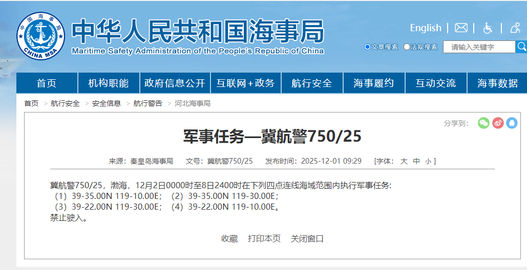 航行警告!渤海部分海域执行军事任务 禁止驶入 2025-12-01 22:23 央视新闻客户端 0 据中国海事局网站消息,秦皇岛海事局发布航行警告,12月2日0时至4日24时、12月2日0时至8日24时,渤海部分海域执行军事任务,禁止驶入。 责任编辑:王逸群