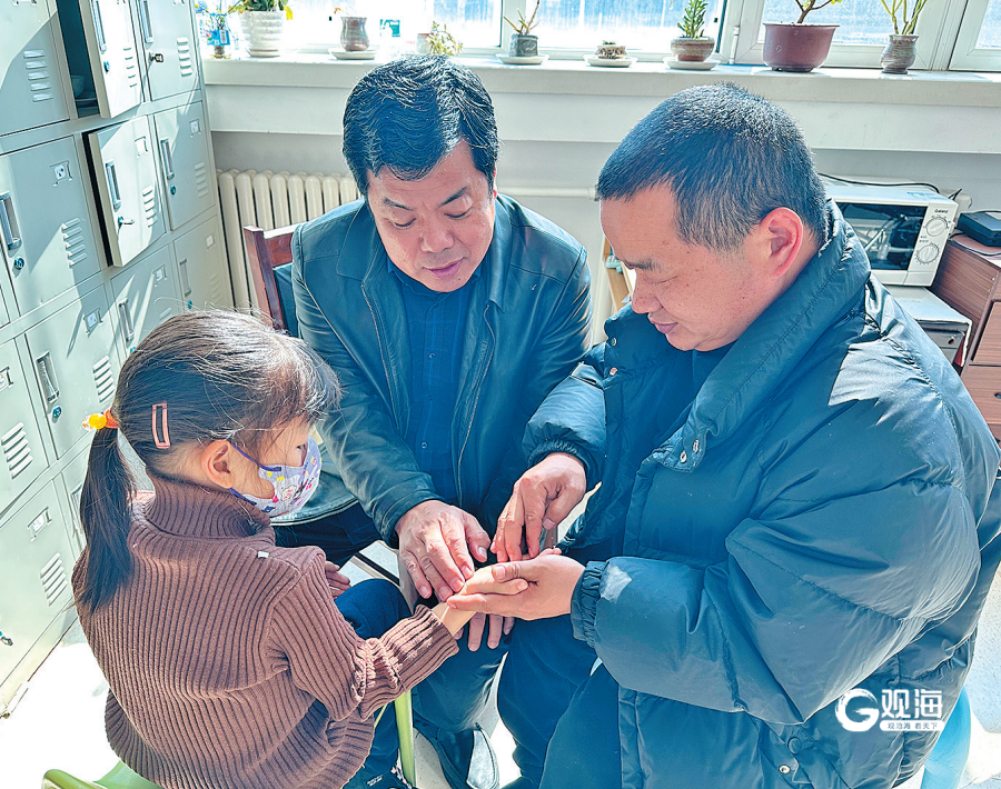 12月1日午后,暖煦的阳光穿透李沧区市民公共服务中心“王春华工作室”的玻璃窗,柔和地铺洒在房间里。王春华端坐窗前,专注地为一名自闭症患儿进行推拿调理。“从指根顺推至指尖,力度要轻缓。”他的声音温和醇厚,自带安抚人心的力量。