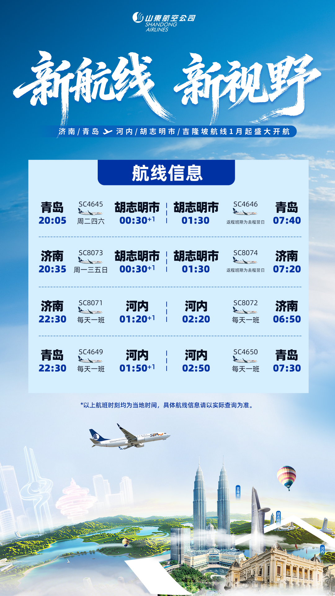 此外,山航计划于1月中旬开通济南、青岛往返马来西亚吉隆坡的直飞航线,相关信息将于近期发布。