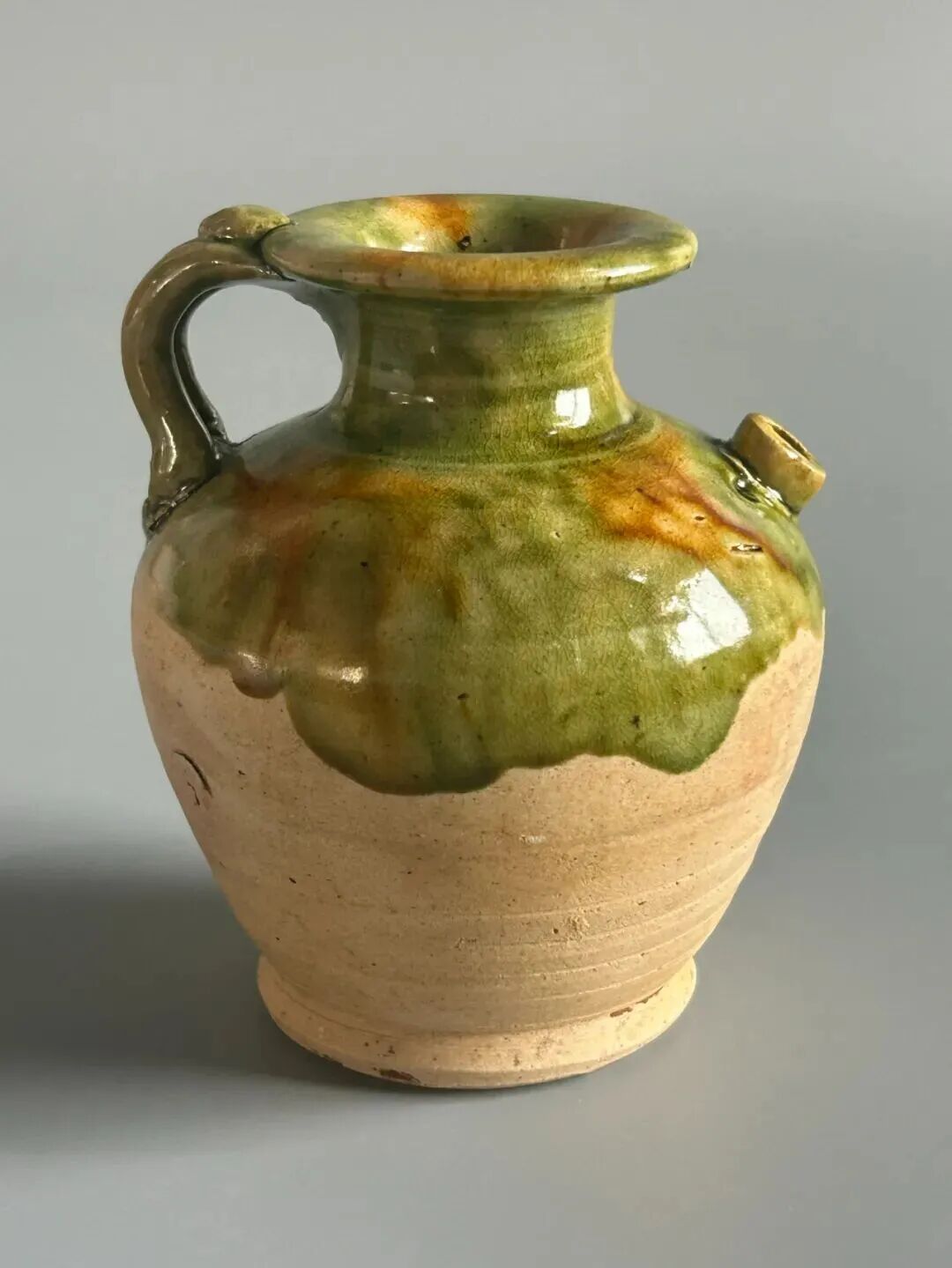 还出土了唐代三彩执壶,壶身侈口,束颈,鼓腹、假圈足。流较短,口沿下至肩部有一桥形鋬,鋬中部有一道凹槽。该壶上半部分饰绿、黄、红三种釉色。