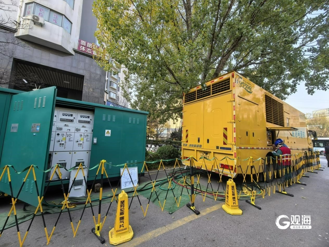 线路迁改过前期,国网青岛供电公司统筹带电作业中心、市北供电中心、新能源科技分公司等部门单位,采用了“低压联络转供+中压发电车不停电接入+带电作业隔离”三技融合的作业方案。施工前,供电人员通过低压联络柜提前转移可转供负荷;作业中,在关键节点采用带电断引线技术,将主线停电范围压缩至最小;同时,通过临时环网柜接入配电室,并由中压发电车同期并网供电,全程保障居民生活和商户经营不受影响。整个迁改过程持续约6小时,各项操作有条不紊,安全措施严密到位。
