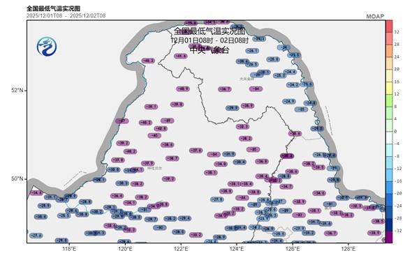 大小兴安岭多地出现-30℃以下的极寒天气,内蒙古图里河-38.7℃(创国家级气象站下半年来新低)、根河-38.6℃、漠河-36.9℃。