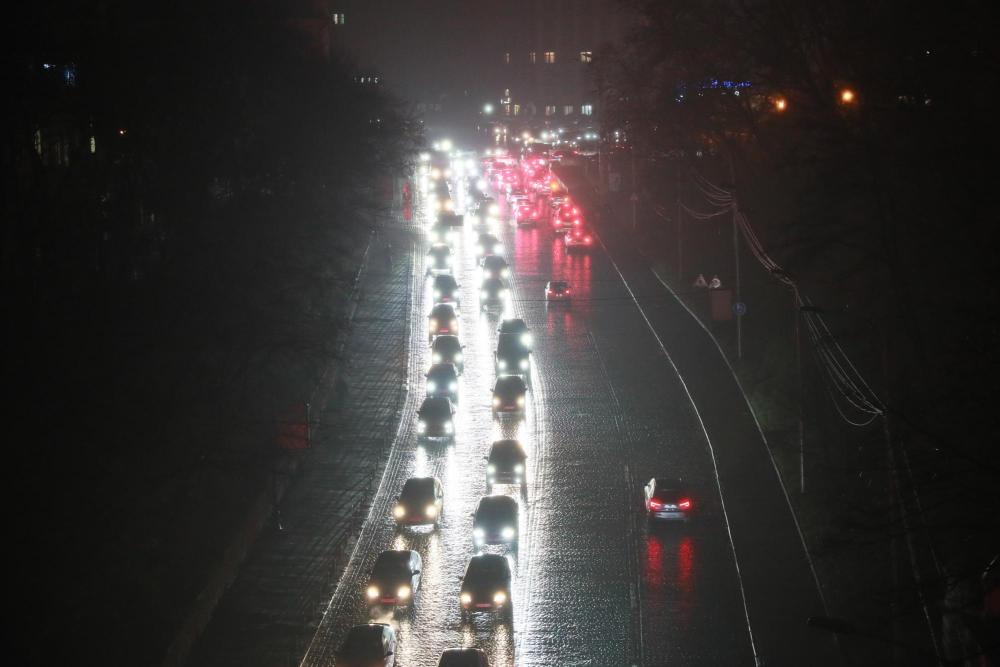 11月20日,乌克兰首都基辅主要街道的照明设施出现大面积停电,车辆在夜色中行驶。新华社记者李东旭摄