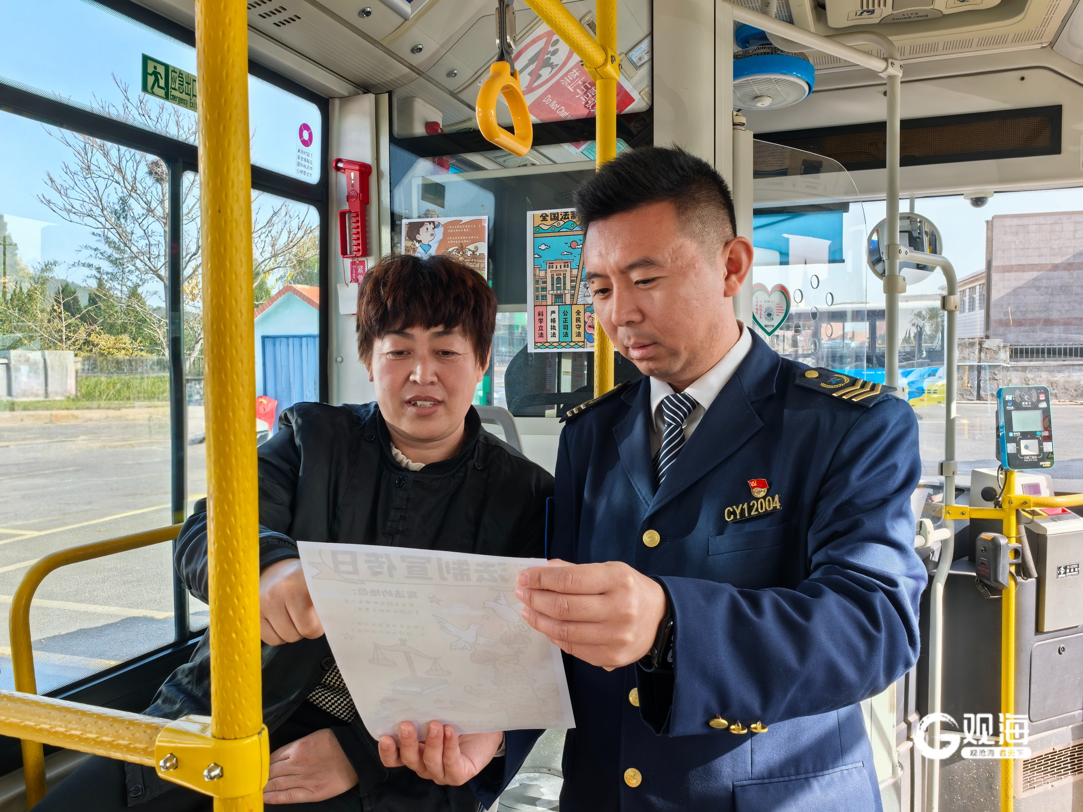除了车厢宣传,温馨巴士“馨飞扬”志愿者在仰口站、山东大学公交换乘站、北宅停车场站等人流密集站点开展流动宣讲,结合真实案例解答法律咨询,内容涵盖劳动权益、邻里纠纷、防诈骗等热点问题。驾驶员也化身“宣传员”,在安全行车的同时主动引导乘客关注普法内容。