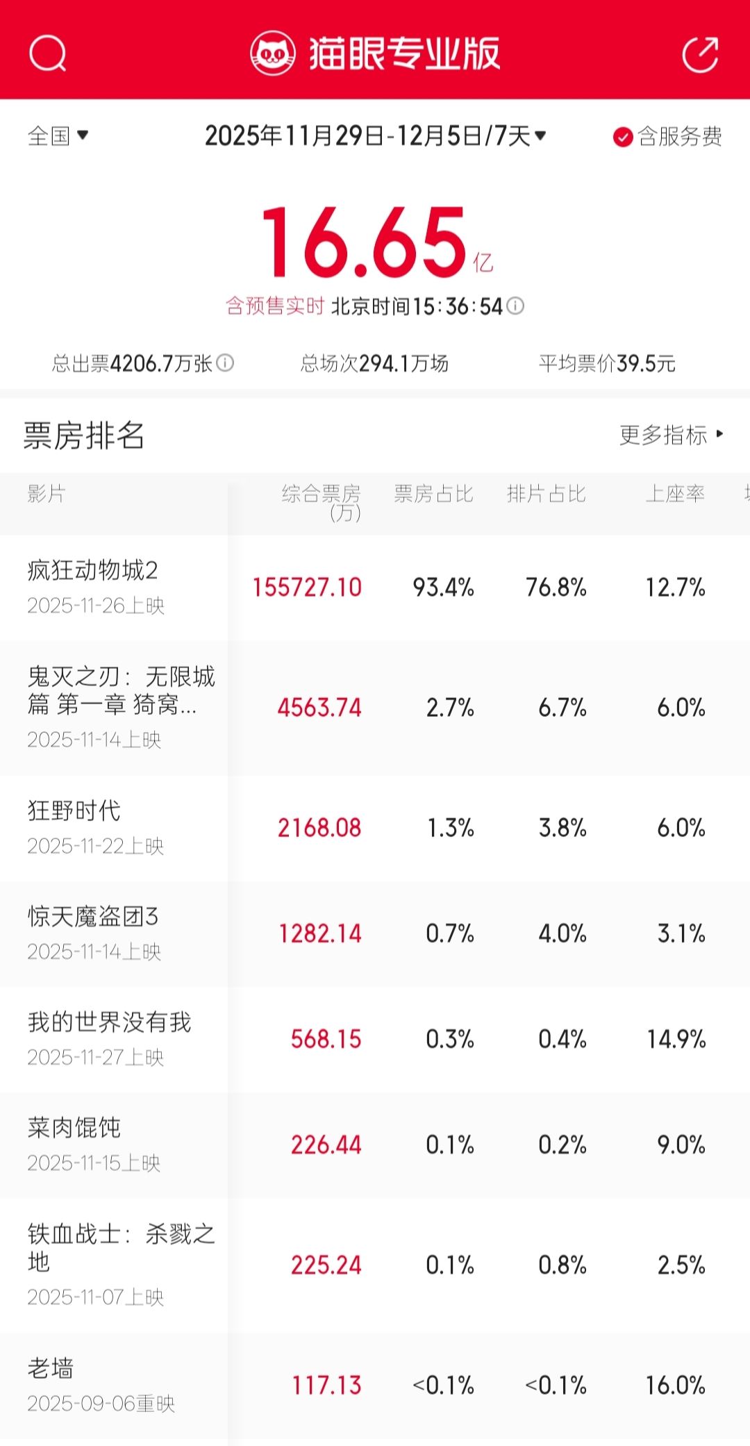 根据猫眼专业版的平台数据,上周青岛影院的大盘热度依然主要由11月26日上映的《疯狂动物城2》支撑。截至12月4日,即上映8日后,《疯狂动物城2》已斩获22亿元票房。目前。其总体排片占比超70%,工作日仍吸引大量家庭与年轻观众涌入影院,多地出现黄金场次售罄现象,再度印证了优质动画内容的市场号召力。