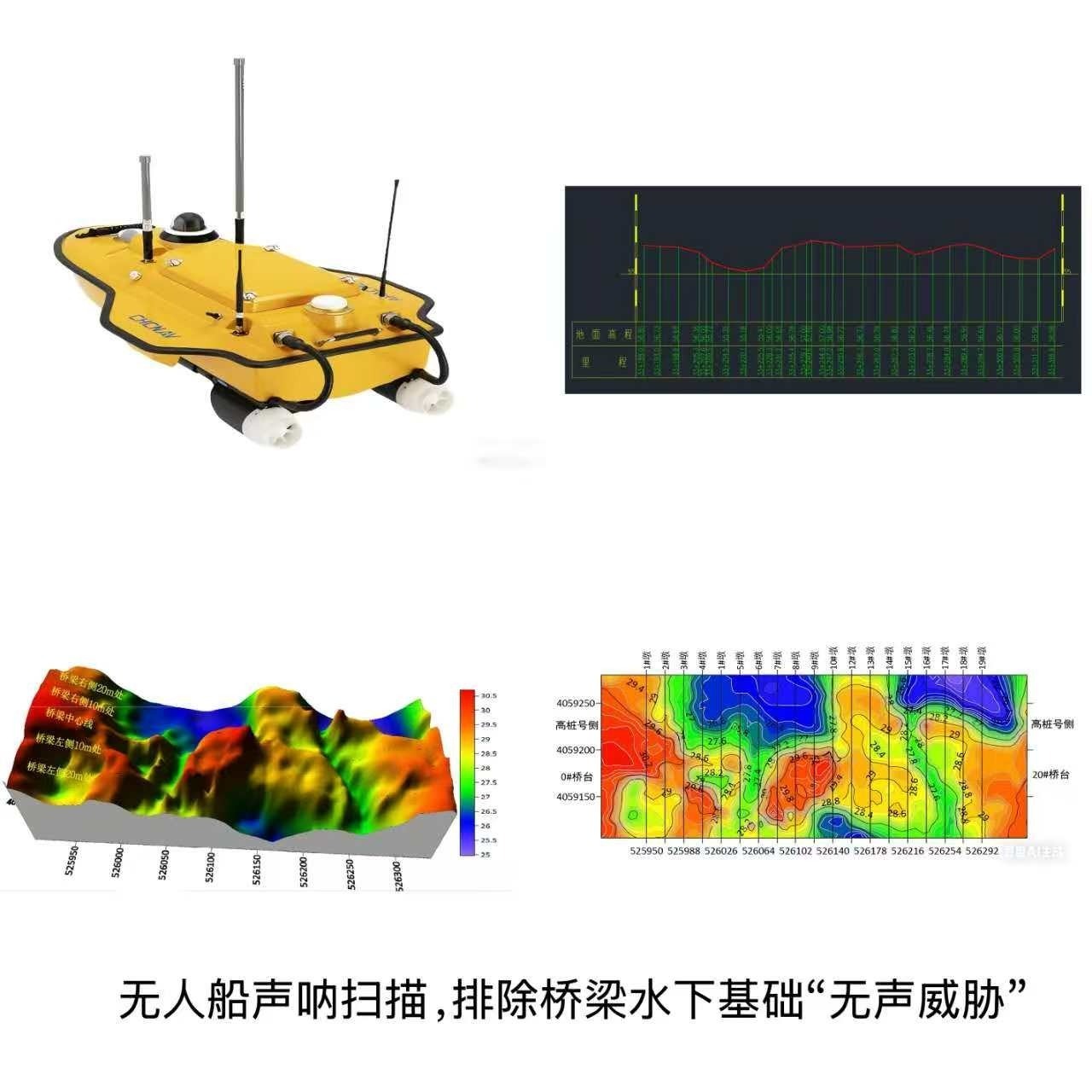水下盲区的智慧检测:面对水下基础检测难题,无人船搭载多波束测深与侧扫声纳系统,对桥墩周围河床进行“CT式”扫描,快速生成高精度三维地形模型。同时,水下蛙人凭借其灵活性与适应性,可深入复杂水下结构,开展近距离视觉检查与影像记录,尤其适用于桥墩局部损伤、水下构件锈蚀等精细排查,为评估桥梁水下基础安全提供双重保障。