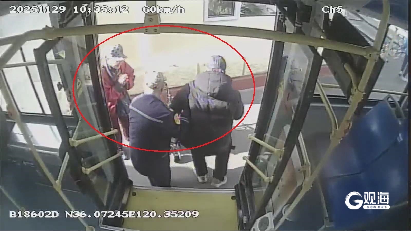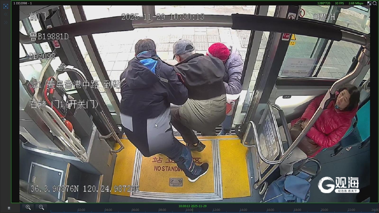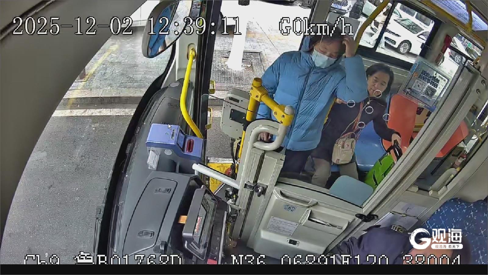 次日下午,相似的温暖在另一条线路上延续。12月2日12时38分,321路驾驶员陈光胜驾驶车辆停靠新浦支路站时,一位老大爷上车后焦急地催促落在后方的老伴。陈光胜没有立即关门起步,而是顺着老人张望的方向望去——约四五十米外,一位老太太正努力地向车站小跑而来。