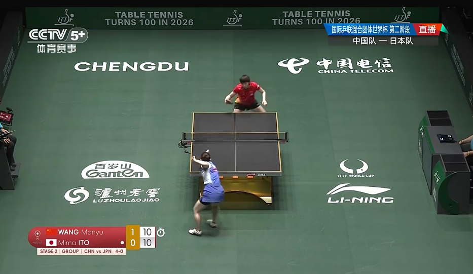 第二场女单比赛,王曼昱2-1战胜伊藤美诚,三局比分为:12-10、10-12、11-2。中国队大比分5-1领先。