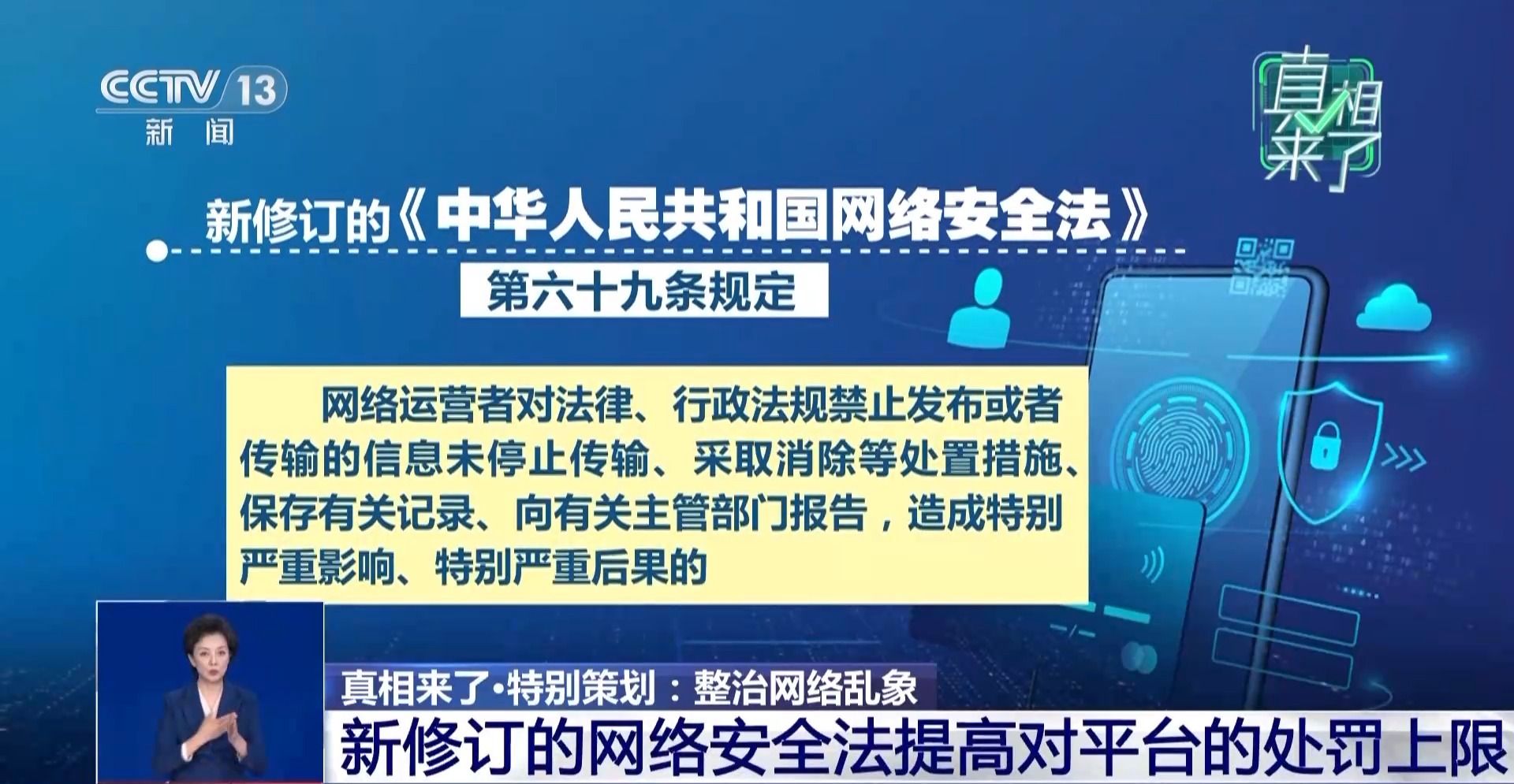 专家提示,明年1月1日起正式施行的新修订的网络安全法,提高了对网络运营者行政处罚的上限,从原来的100万元提高至1000万元。第六十九条规定, 网络运营者对法律、行政法规禁止发布或者传输的信息未停止传输、采取消除等处置措施、保存有关记录、向有关主管部门报告,造成特别严重影响、特别严重后果的,由有关主管部门处二百万元以上一千万元以下罚款,责令暂停相关业务、停业整顿、关闭网站或者应用程序、吊销相关业务许可证或者吊销营业执照。