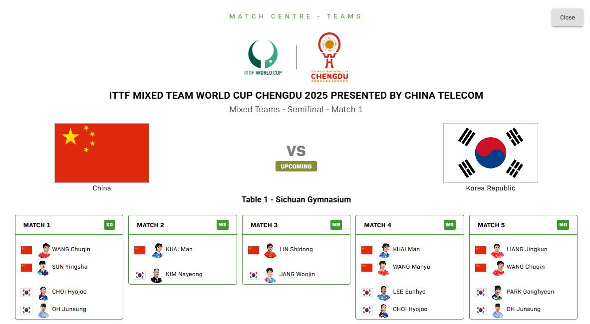 12月7日,2025年国际乒联混合团体世界杯半决赛,中国队将对阵韩国队。