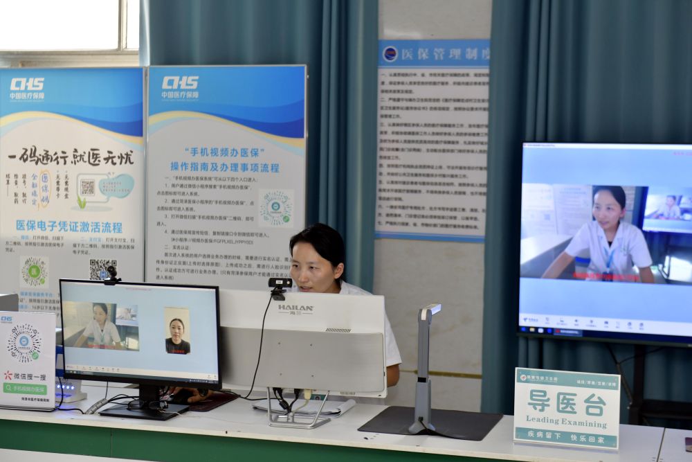 在山东省郓城县随官屯镇卫生院医保便民服务站,工作人员在开展“手机视频办医保”业务。新华社记者 郭绪雷 摄