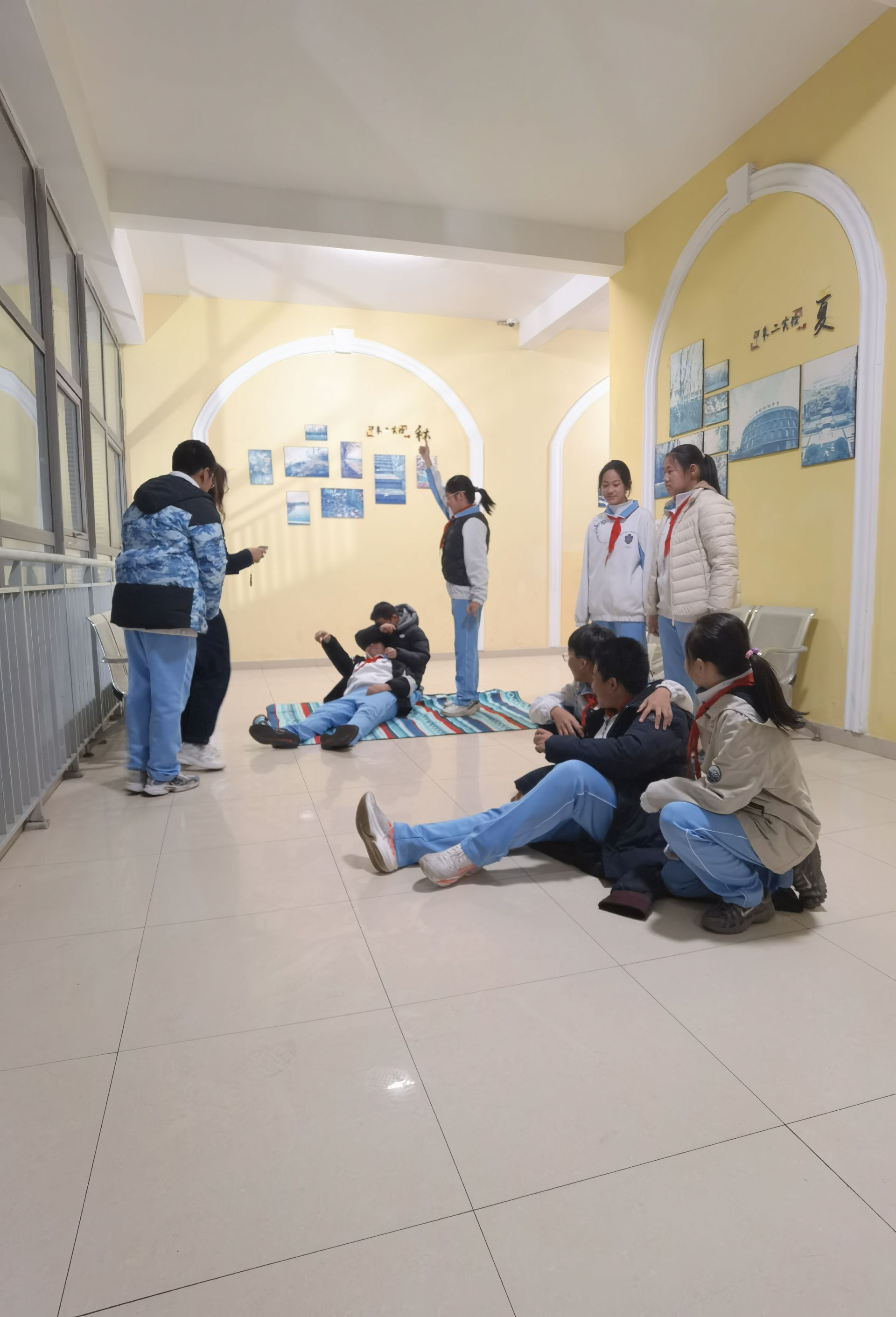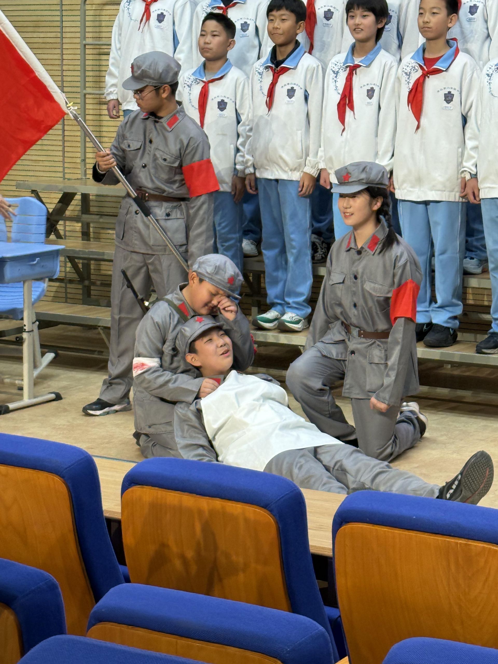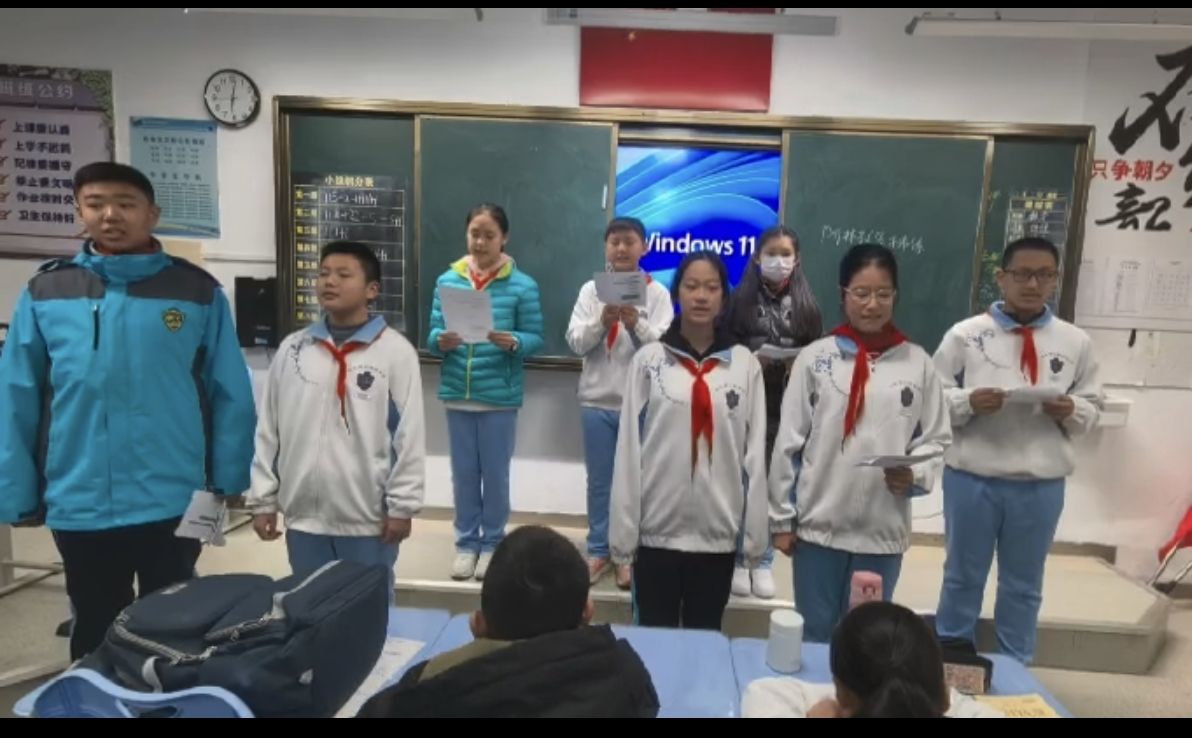 “红军不怕远征难,万水千山只等闲”,集体朗诵《七律·长征》,整齐划一、铿锵有力的气势席卷全场。四十八个声音汇聚成一道声浪,不再是简单的背诵,而是带着对之前情景表演的理解与共鸣。“五岭逶迤腾细浪”,他们的手臂起伏如连绵山峦;“金沙水拍云崖暖”,声音陡然转亮,仿佛江涛拍岸。当朗诵到“更喜岷山千里雪”时,全班同学昂首挺胸,眼神坚定——那一刻,他们不只是诵读诗词的少年,更是与那段伟大历史同频共振的传承者。