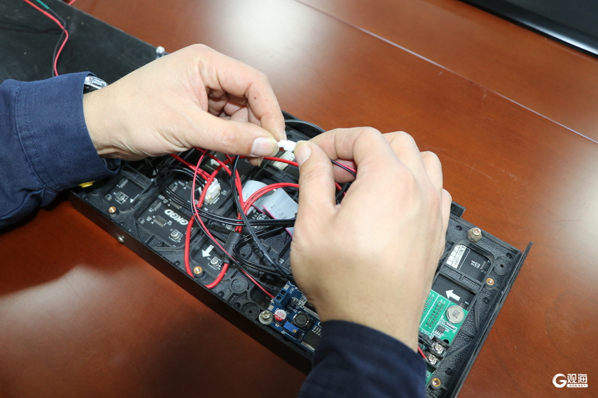 解决完配件问题后,班组利用废旧亚克力板自制外壳时,难题又接踵而至:板材表面氧化严重,即便打磨清洁,染色后仍易出现色差、透光斑驳,班组通过多次喷涂才达到想要的效果;车辆主线路电压随行车波动,必须多次测量空载与负载电流,避免误接烧毁设备,同时要兼顾行车颠簸,需额外加固线路与支架,平衡稳固性与后期检修便捷性。通过一次次测量、加固、试验后,LED屏终于稳定“上岗”。