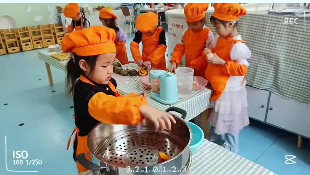 小班宝贝们聚焦“基础劳动体验”,在老师的耐心引导下,小手攥着土豆、地瓜认真揉搓清洗,不仅洗净了食材,更在重复的动作中锻炼了手部精细动作与专注力;中班孩子们挑战“协作制作”,分组分工、默契配合,有的递食材、有的搭把手,在互帮互助中完成美食工序,悄悄读懂了“团结力量大”的道理;大班“哥哥姐姐们”则大胆尝试自主创作,从揉面、调馅、包馒头,到榨新鲜果蔬汁、蒸软糯美食、熬香甜小汤、烙酥脆小饼、炒简易小菜、包营养饭团,全程沉浸式参与美食制作的完整流程,尽情发挥创造力与动手能力。