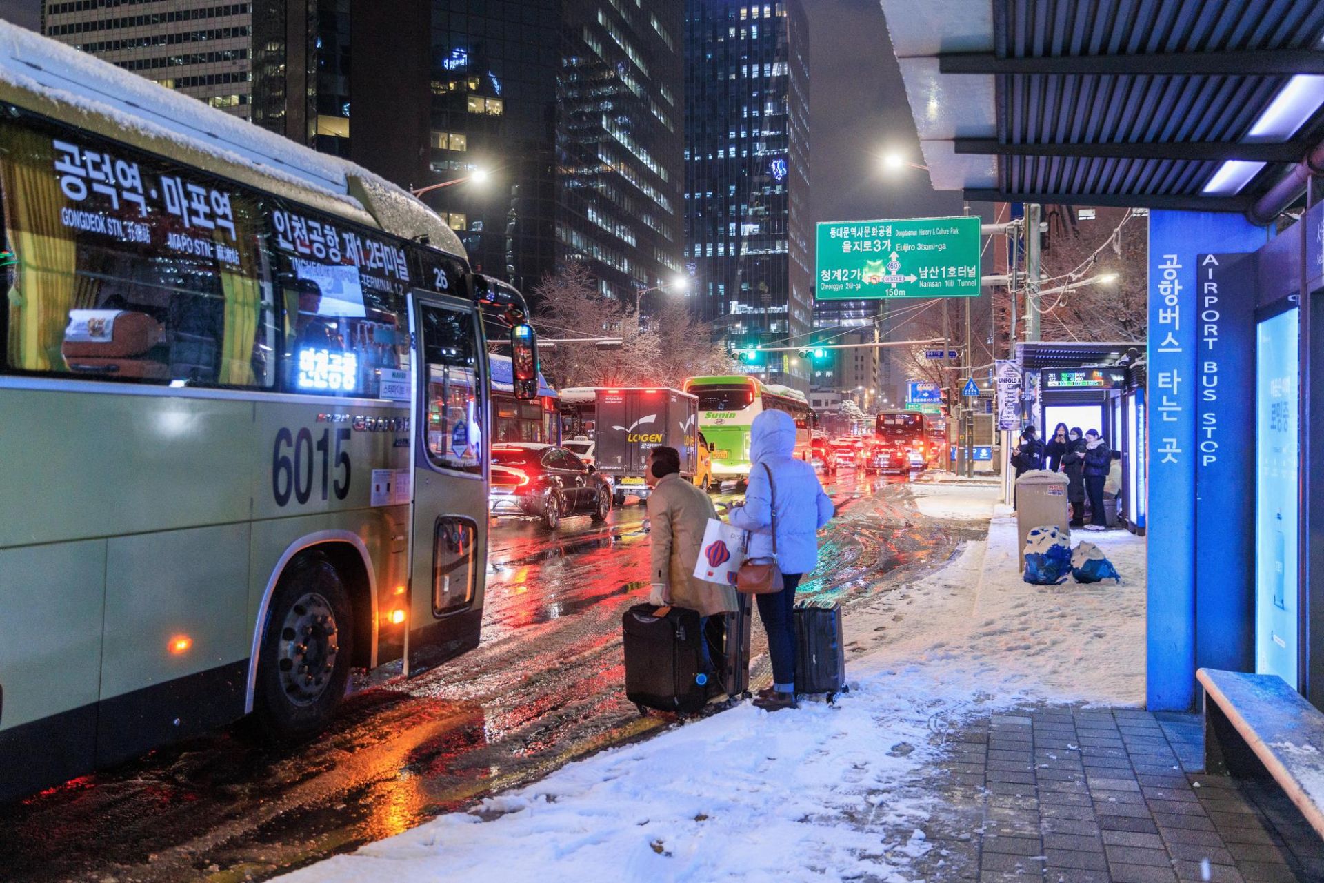 12月4日,在韩国首尔,人们在雪中候车。新华社发(朴晋泽摄)