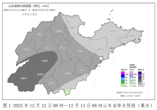 雨雪:12—13日,我省自西向东将出现降雪天气,累积平均降水量2~5毫米(图1)。其中,12日白天到夜间,菏泽、济宁、枣庄、临沂北部、聊城、德州、滨州、泰安、济南、淄博和潍坊有中雪部分地区有大雪,最大积雪深度2~5厘米,其他地区有雨夹雪转小到中雪,最大积雪深度1~3厘米;13日白天到夜间,半岛地区有小雪。