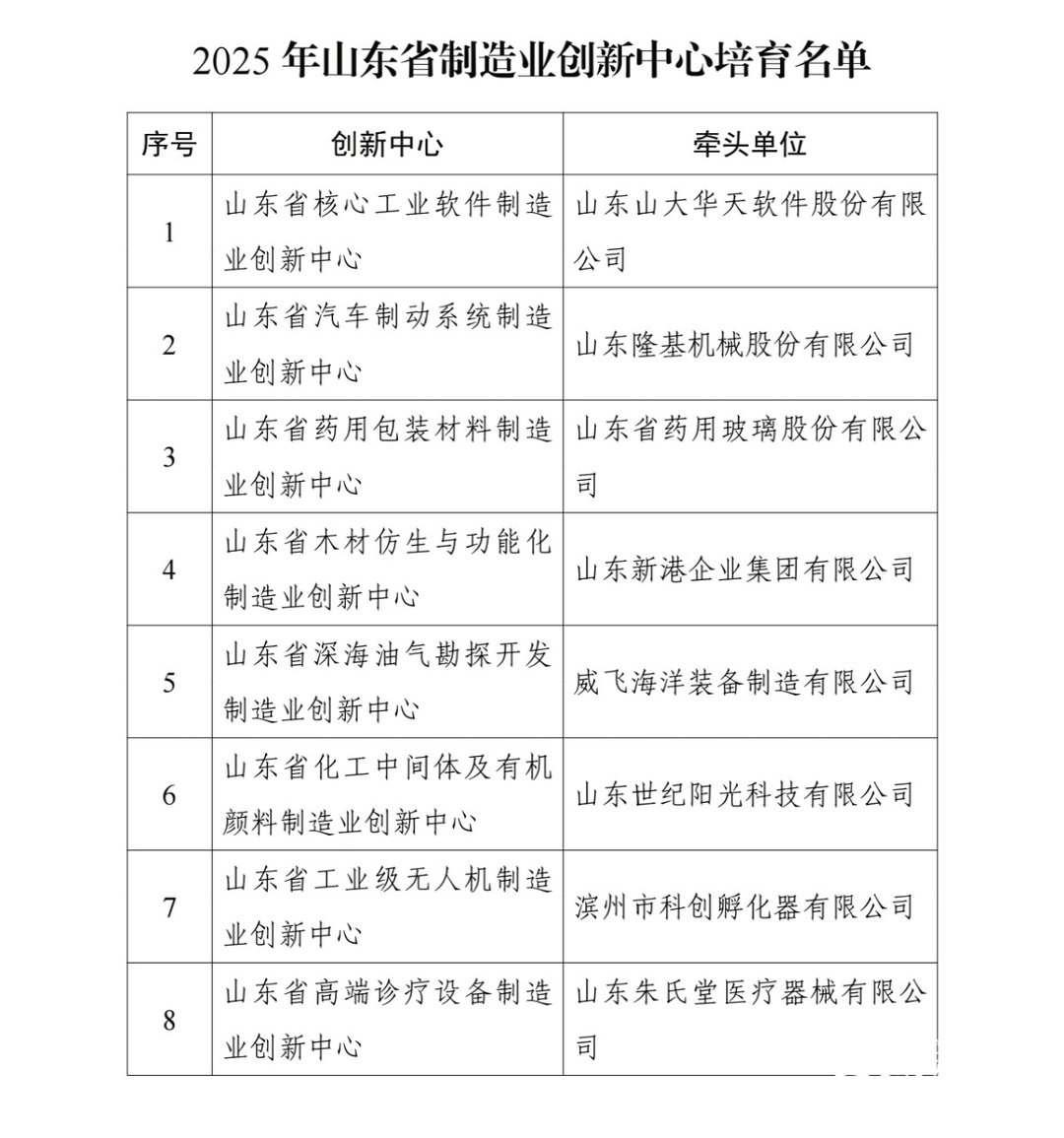 山东省工业和信息化厅日前组织开展了山东省制造业创新中心认定和培育工作。经企业申报、市级推荐、专家论证等程序,济南二机床集团有限公司牵头建设的山东省高档数控机床制造业创新中心等6家中心被认定为山东省制造业创新中心,山东山大华天软件股份有限公司牵头组建的山东省核心工业软件制造业创新中心等8家中心被列为山东省制造业创新中心培育对象。