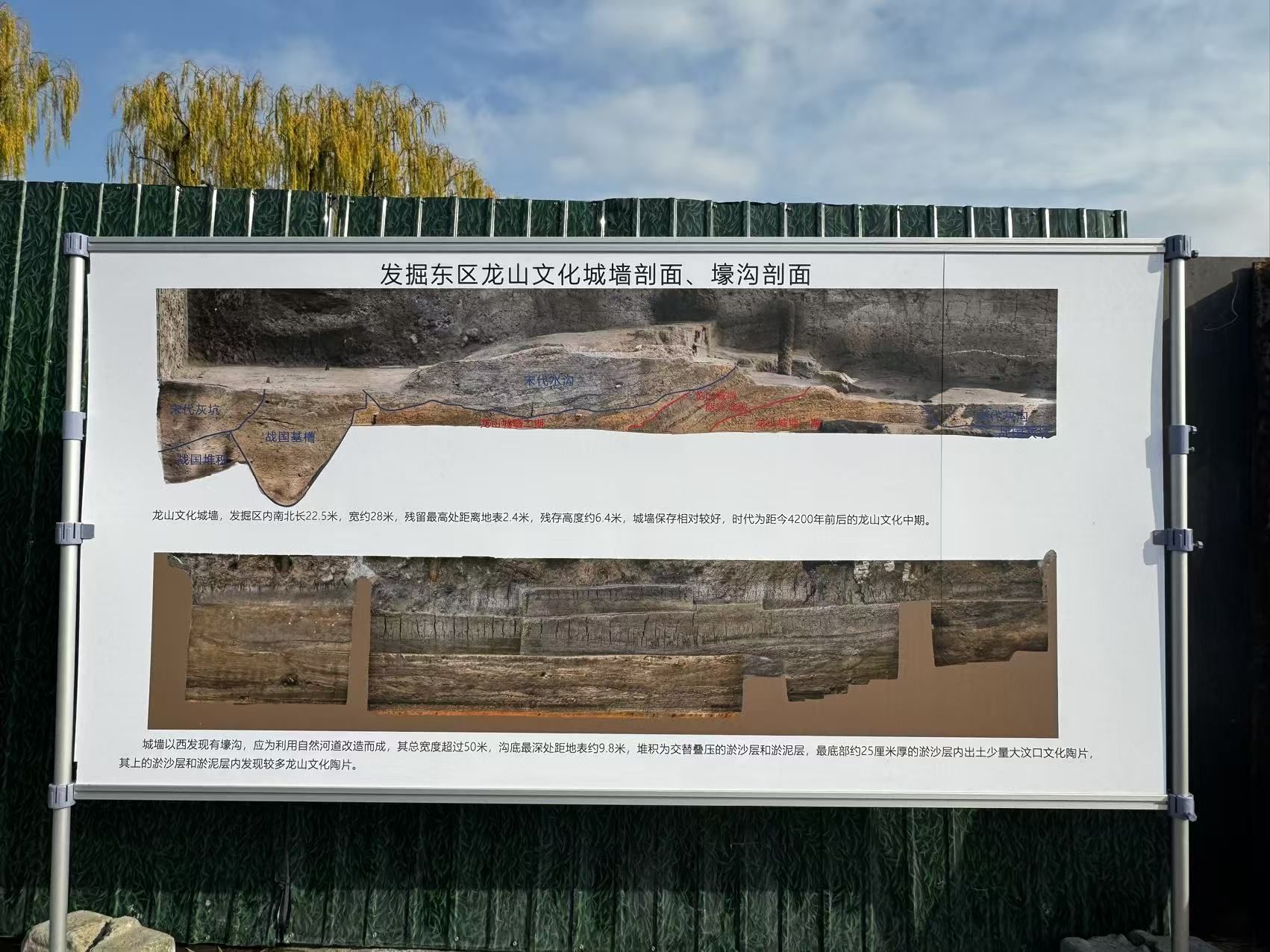 此次发掘最核心的成果是龙山文化城墙及壕沟的发现。该城墙位于发掘区东端,南北长22.5米且向两侧延伸出发掘区,宽约28米,残存高度约6.4米,为人工层层堆筑而成。城墙内出土磨光黑陶片、刻有精美纹饰的蛋壳陶片等典型龙山文化遗物,还发现1例人头骨,推测城墙建造过程中可能存在祭祀活动。经碳14测年及专家论证,该城墙为龙山文化时期城址西城墙,距今约4200年,且有岳石文化及战国时期补筑痕迹。