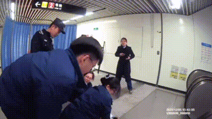 在扶梯口处,一位60多岁的男乘客仰卧在地,面色苍白、呼吸微弱。孙瑶跪地检查。与此同时,周新超、闫鹏、宓雨禾与保安单宝龙,快速用屏风围出救援区域,引导客流、维持秩序。