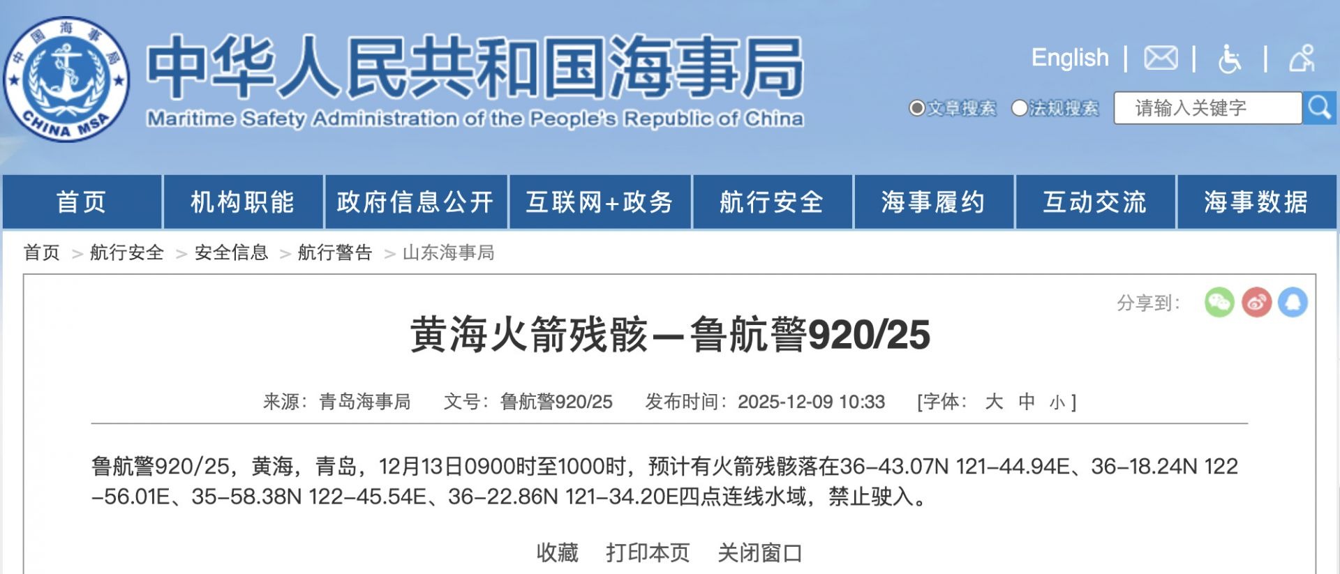 青岛海事局发布航行警告:黄海一水域明天有火箭残骸掉落,禁止驶入 2025-12-12 09:23 中国海事局网站 0 据中国海事局网站消息,青岛海事局发布航行警告,12月13日9时至10时,黄海水域有火箭残骸掉落,禁止驶入。 责任编辑:程雪涵