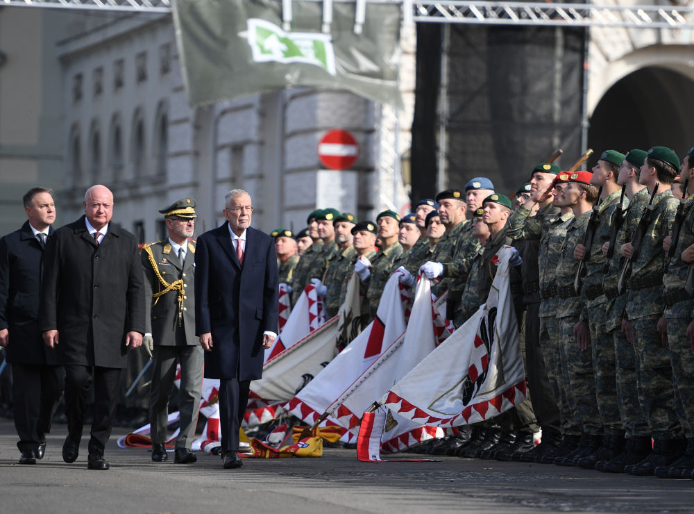 10月26日,在奥地利维也纳,奥地利总统范德贝伦(前右)和总理施托克尔(前左)检阅入伍新兵。新华社记者贺灿铃摄
