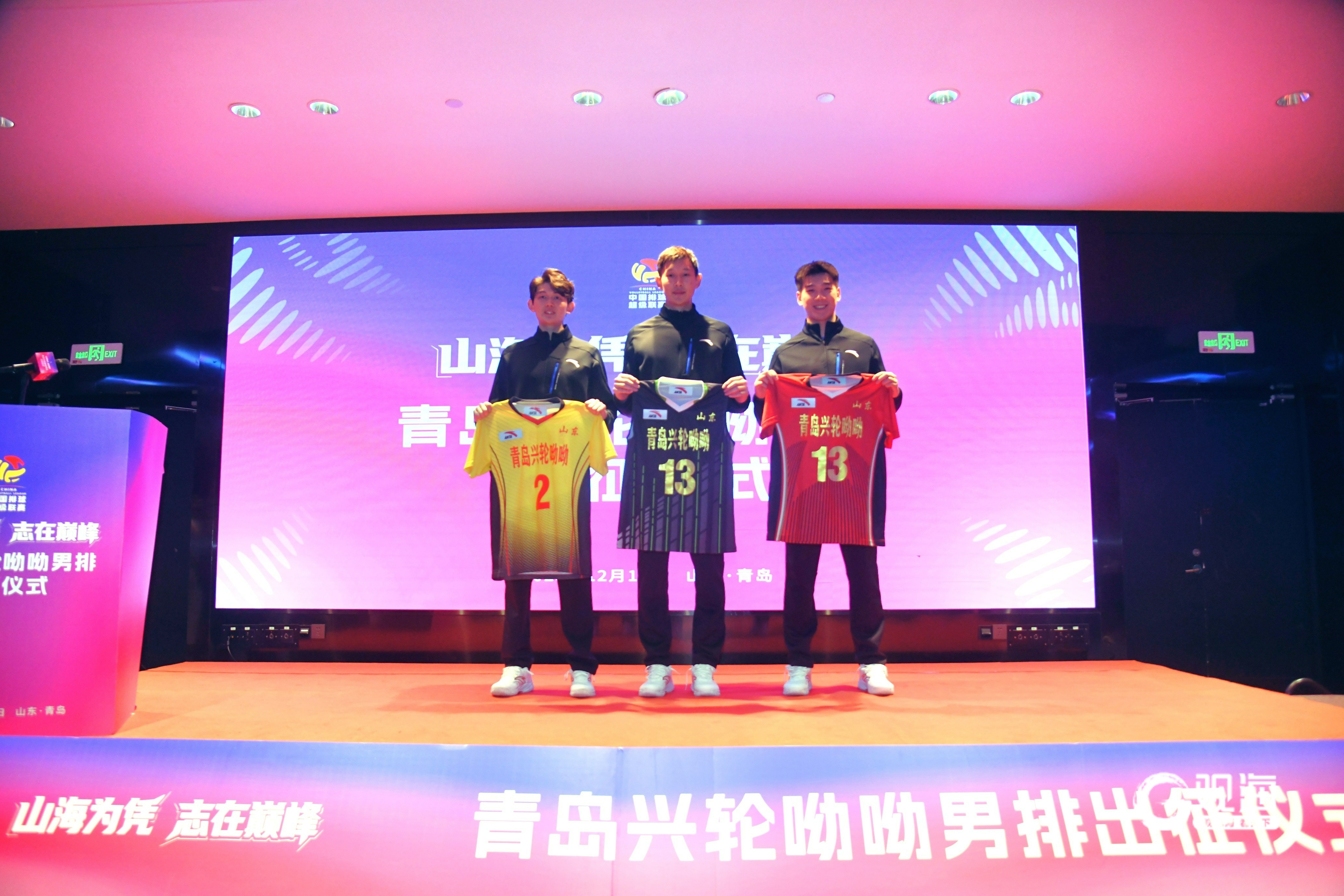 仪式上,青岛兴轮呦呦男子排球队全体队员整齐亮相,运动员代表王径一、翟德军、范宣玉展示了全新设计的比赛服。球衣融合青岛山海元素与球队标识,象征着荣誉与使命的交融。
