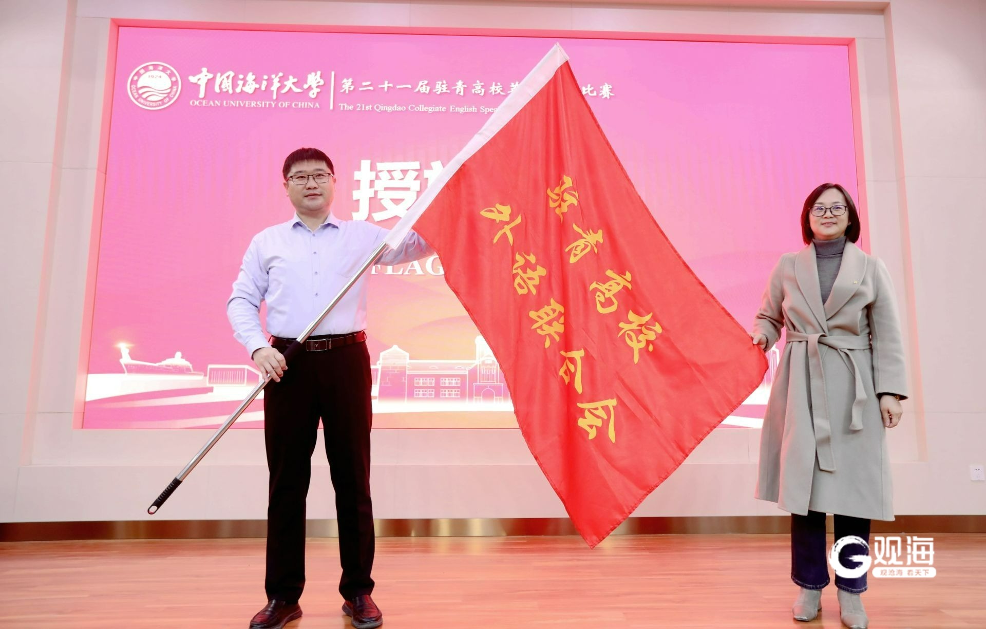 颁奖仪式环节,评委对选手表现进行了专业点评。授旗仪式上,中国海洋大学外国语学院党委副书记、副院长戴淑妮向青岛科技大学外国语学院党委副书记、副院长马寒移交赛旗,下一届大赛将由青岛科技大学主办。