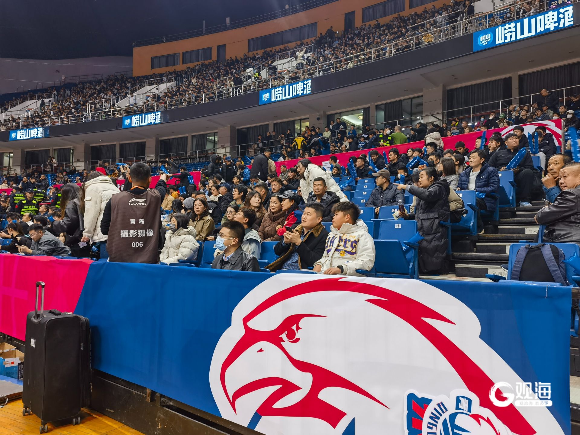 本赛季,青岛男篮正式更名为青岛崂山啤酒男篮,场内增添了不少啤酒元素。赛前,印有球队新球衣的巨大Tifo在中圈徐徐展开,六个啤酒瓶吉祥物伴随入场。据悉,俱乐部在中场时间设置了崂山啤酒酒王争霸赛。现场观众只要在规定时间内畅饮完青岛啤酒无醇白啤,就能赢得专属礼品。同时,青岛国信啦啦队换血升级,岛城唱跳歌手大花也空降国信体育馆。在赛前热场环节,观众跟随音乐挥舞充气棒,被镜头扫到的球迷尽情舞蹈,现场的气氛已经被引燃。