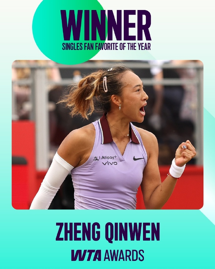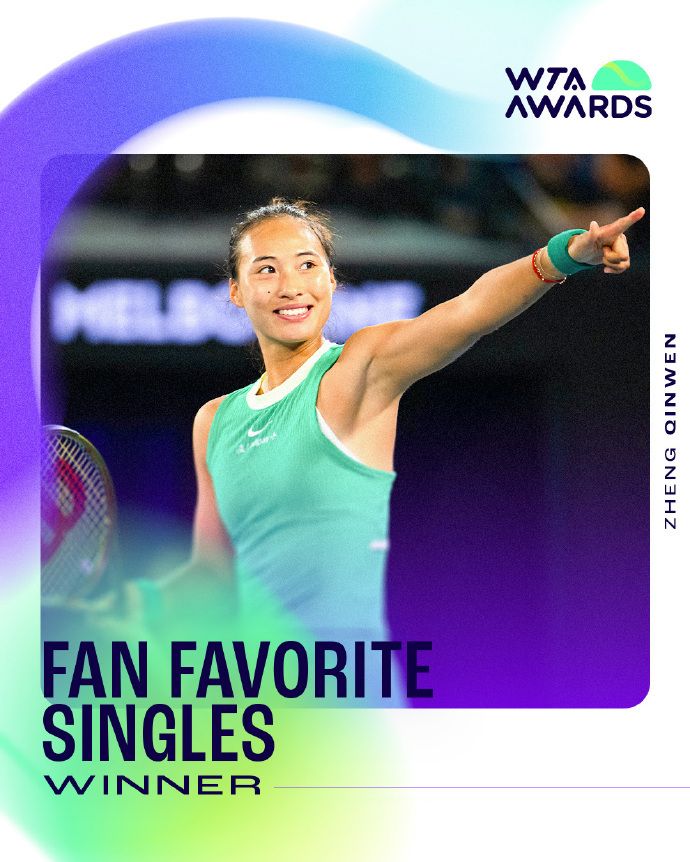 据WTA国际女子网球协会,郑钦文今年当选WTA年度最受欢迎单打球员,这是她连续第二年当选。