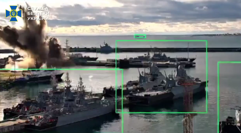 △乌国家安全局公布的炸毁俄“华沙女人”级潜艇视频截图