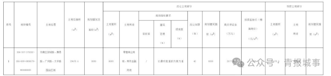该宗地位于市南区郯城路、费县路、广州路、太平路围合区域,土地总面积29678.6平方米。其中,出让土地部分,土地面积8000平方米,规划建筑面积8000平方米,土地用途为零售商业用地、商务金融用地;划拨土地部分,土地面积21678.6平方米,土地用途为广场用地。