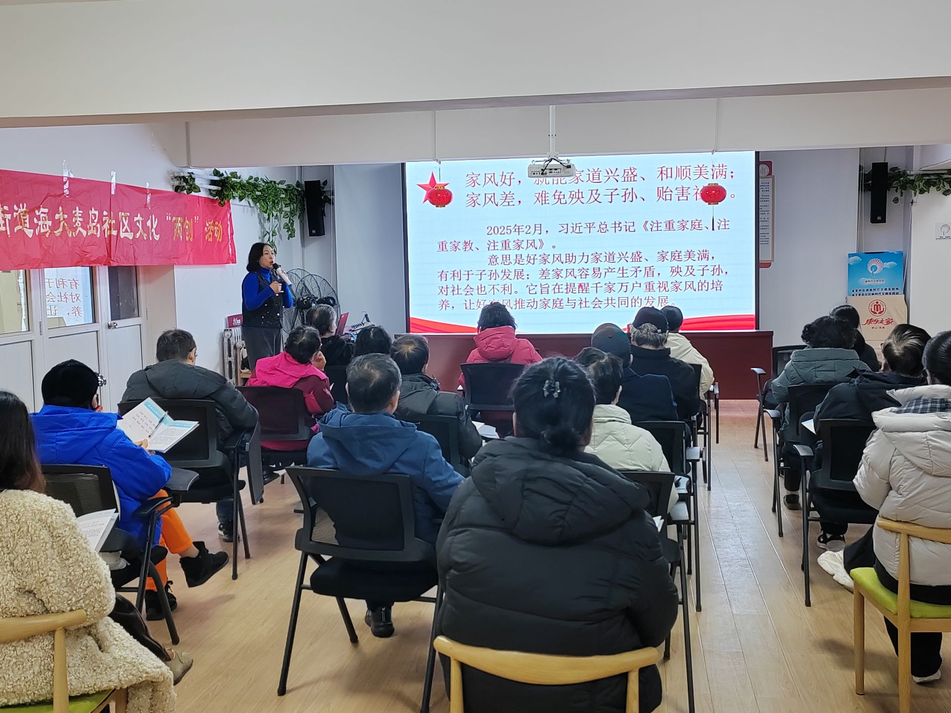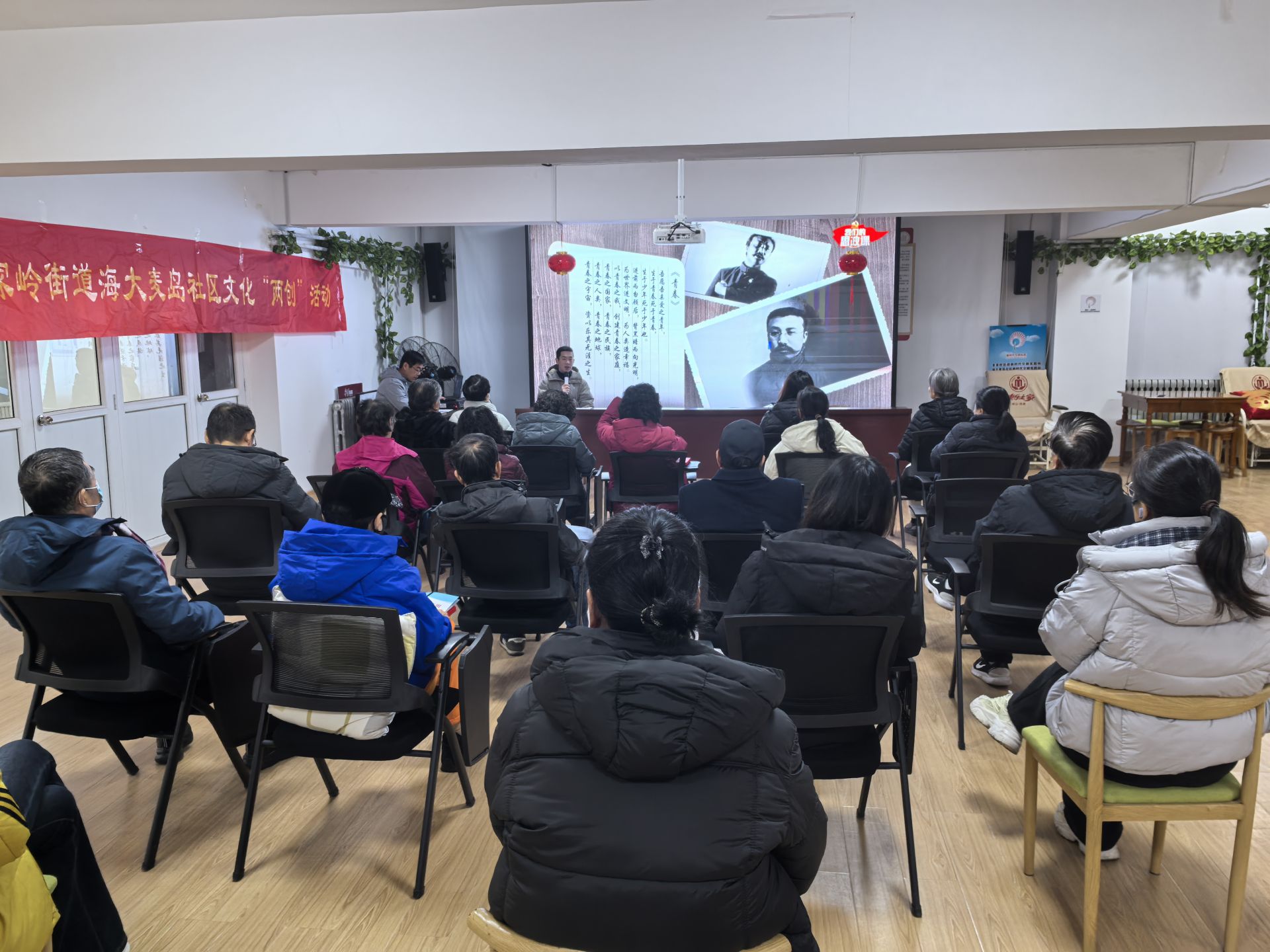 为推动党的创新理论走进基层、浸润人心,12月12日,海大麦岛社区党委以主题党日为抓手,联动各小区党支部开展“行走的思政课·社区实践日”活动。一场别出心裁的沉浸式音乐思政课《我们的思政课》在此拉开帷幕,该课程由崂山融媒张伟超老师精心打造,以“音乐+影像”的跨界融合形式,为在场党员带来了一堂有深度、有温度的精神盛宴。