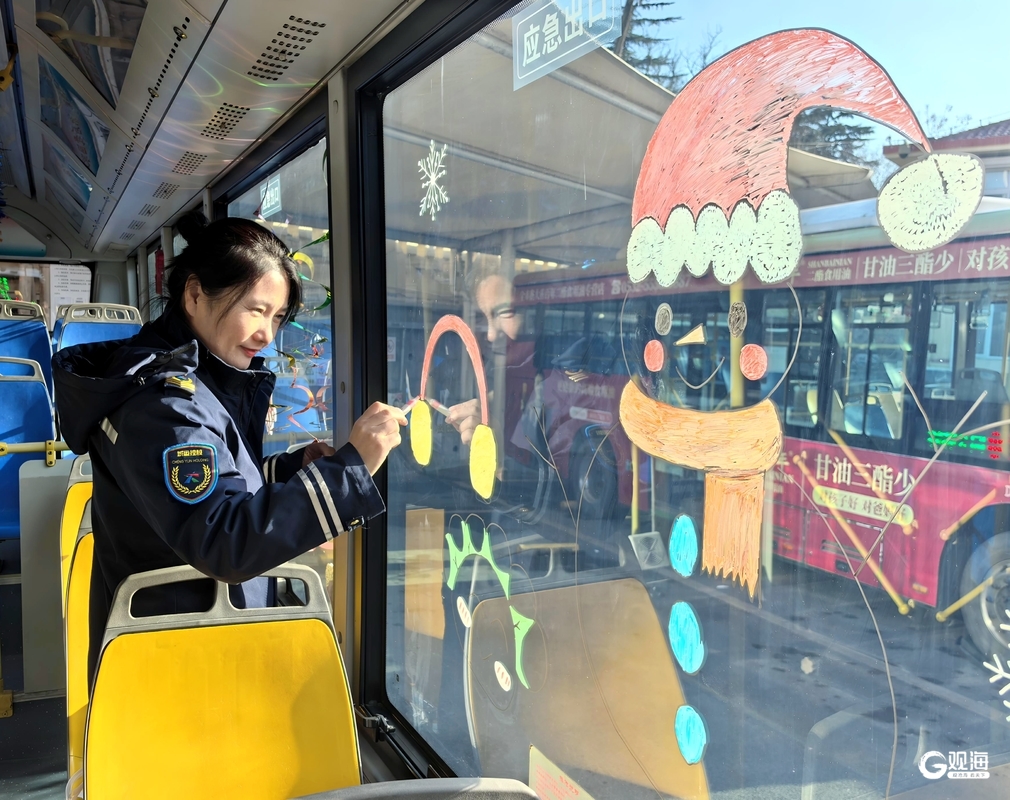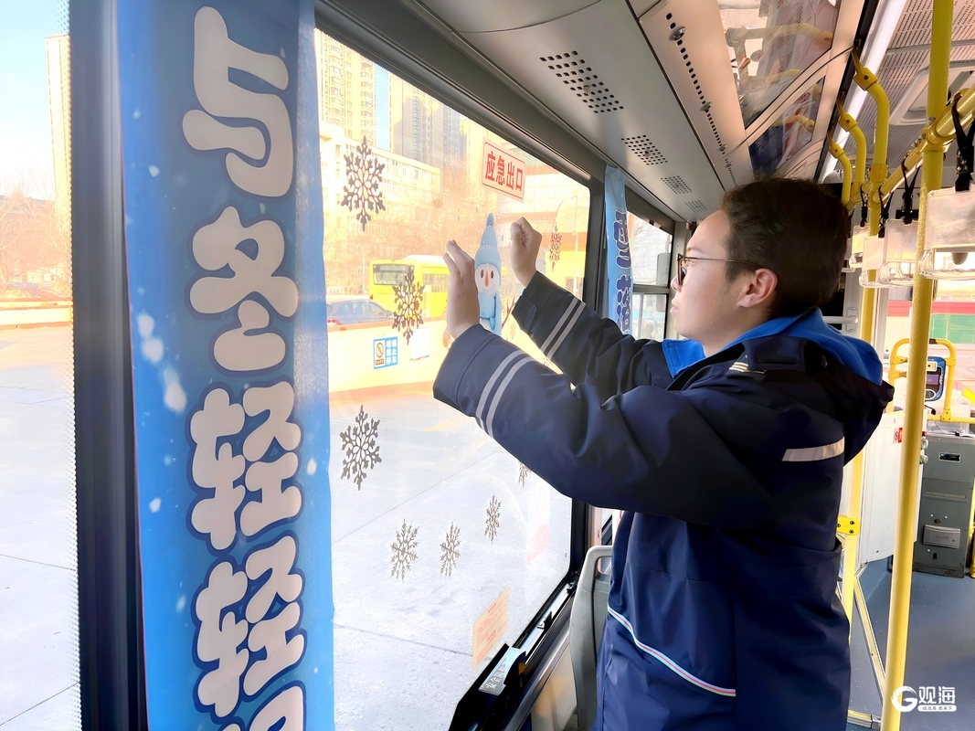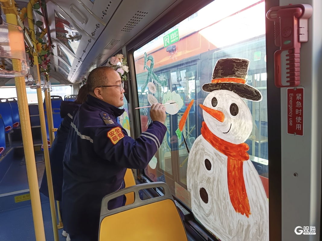 与之相映成趣的,是11路的“雪人海洋”主题车厢。它巧妙地将青岛的城市基因——海洋元素,与冬日意象完美融合。车窗上,工作人员手绘的戴红围巾、顶俏皮帽的雪人栩栩如生,与灵动海豚、斑斓热带鱼、可爱企鹅等海洋主题贴纸相映成趣。蓝色的拉花缠绕扶手,随风轻曳,营造出海底世界般的梦幻感。作为连接市区与极地海洋世界等景点的重要线路,11路车厢化身为一个流动的“冰雪海洋馆”,让市民游客在奔赴目的地的途中,提前沉浸于冬日浪漫与海洋奇妙的双重奏鸣,极大提升了出行体验的趣味性与获得感。
