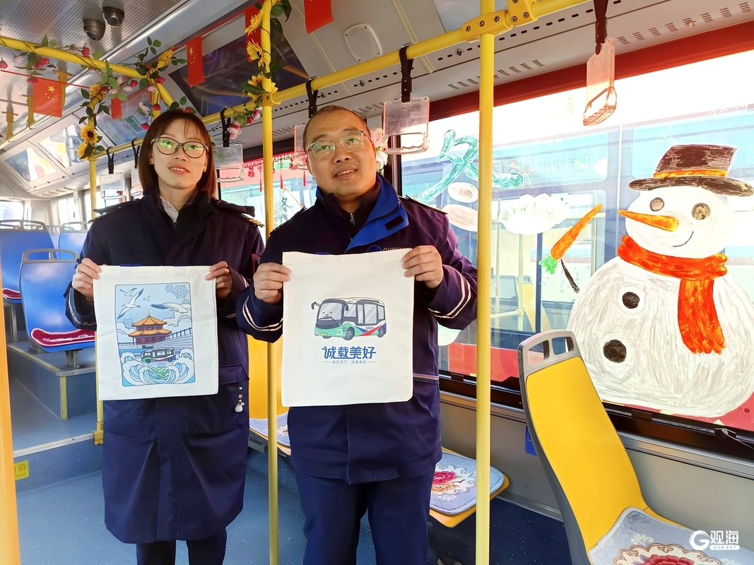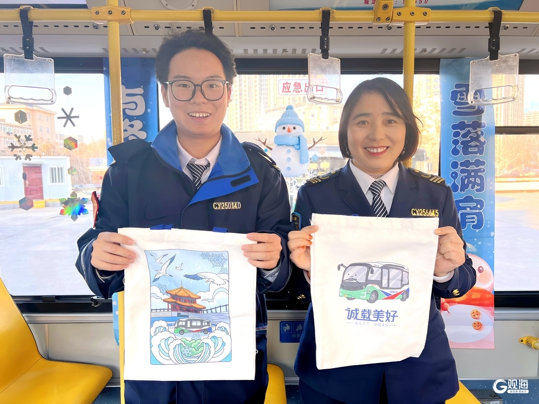 参与者将拍摄的照片或短视频,分享至小红书、微博等任意社交媒体平台,并在发布时带上活动专属话题#青岛暖冬巴士,便可前往所属场站领取精美的“冬日限定帆布包”。帆布包以青岛栈桥冬日胜景为设计灵感,冷蓝色调包裹着海浪与雪花的意象,画面中央是栈桥回澜阁,雪花轻落,越冬海鸥盘旋。“我们特意融入了‘宝宝巴士’的元素,既呼应乘坐公交观鸥的日常,也为冬日场景注入暖意,巧妙融合了城市地标的浪漫与市井生活的趣味。”市南巴士公司相关负责人表示,活动礼品数量有限,先到先得,赠完即止。