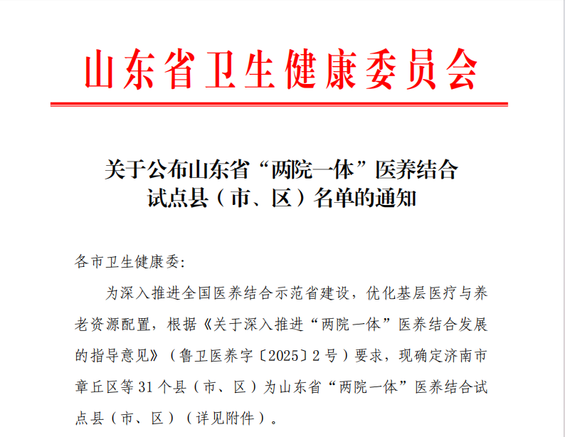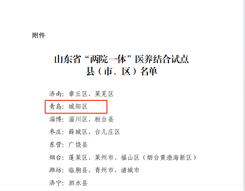 青岛日报社/观海新闻12月21日讯 近日,山东省卫生健康委员会印发《关于公布山东省“两院一体”医养结合试点县(市、区)名单的通知》,城阳区成功入选山东省“两院一体”医养结合试点区县。