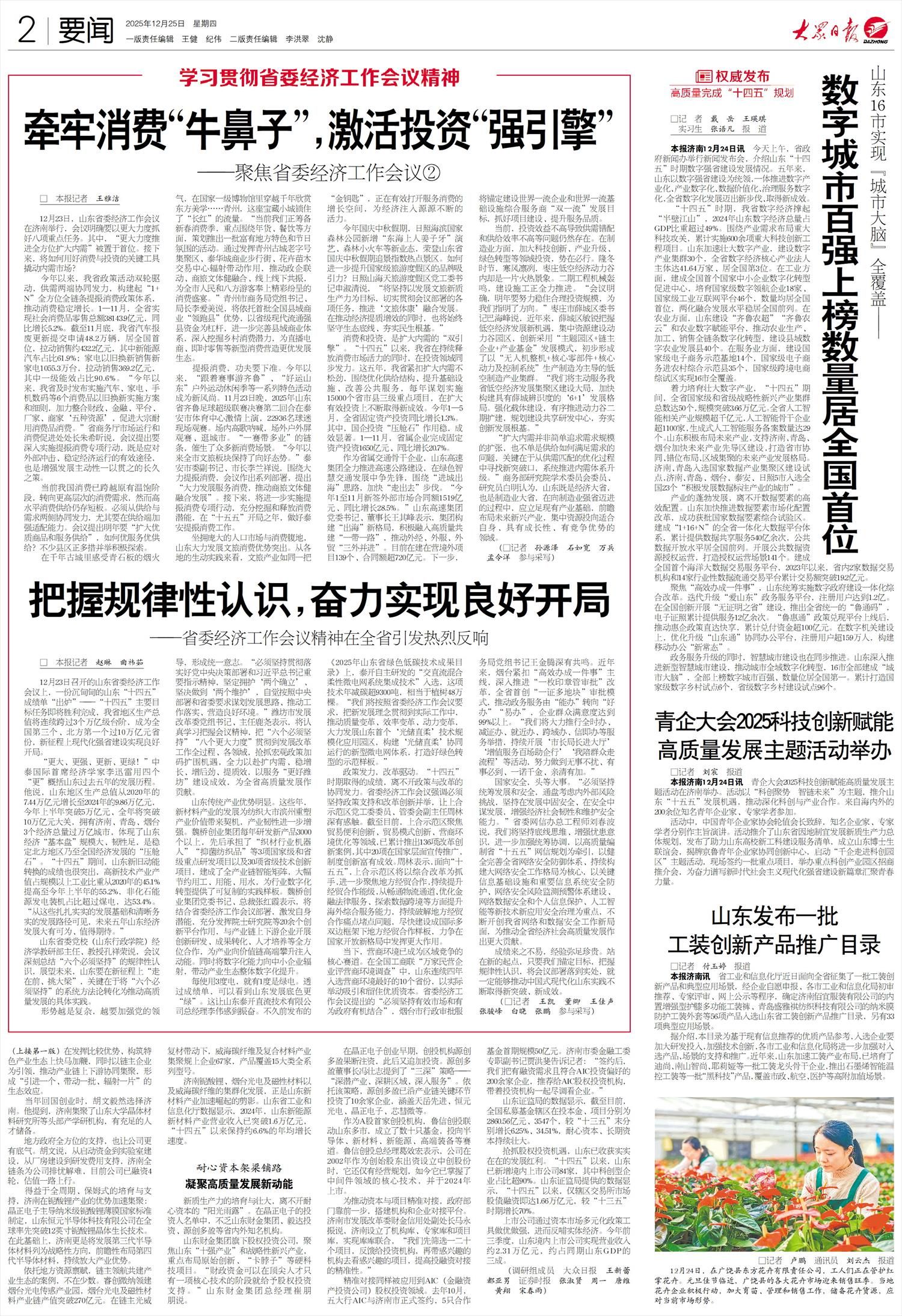 山东传统产业优势明显。这些年,新材料产业的发展为纺织大市滨州重塑产业价值带来契机,产业韧性进一步增强。魏桥创业集团每年研发新产品3000个以上,先后承担了“织材行业机器人”“抑菌纺织品”等3项国家级和省级重点研发项目以及30项省级技术创新项目,建成了全产业链智能矩阵,大幅节约用工、用能、用水,为行业数字化转型提供了可复制的实践样板。魏桥创业集团党委书记、总裁张红霞表示,将结合省委经济工作会议部署,激发自身潜能,充分发挥院士研究院等20余个创新平台作用,与产业链上下游企业开展创新研发、成果转化、人才培养等全方位合作,为产业向价值链高端攀升注入动能。同时将数字化能力向中小企业辐射,带动产业生态整体数字化提升。