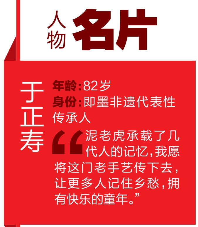 一支画笔,勾勒出民间艺术的华章;一抷泥土,传承着历史文化的印迹。今年82岁的于正寿介绍,看似简单的泥老虎,从第一步取土到最后制成成品,需经过十多道工序,包括选泥、制模、磕坯、修坯、做哨、涂粉、上色等。不仅对土、制成的坯有要求,作画、上色的技巧也很有讲究,彩绘堪称泥老虎的点睛之笔。泥老虎制作完成后,将头部和尾部互相挤压,会发出响声。