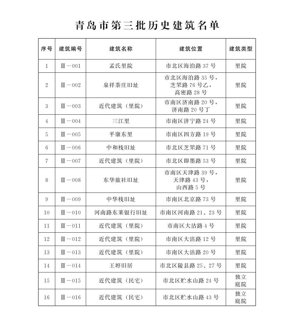 为进一步加强我市历史文化建筑的保护与管理,依据《历史文化名城名镇名村保护条例》《山东省历史文化名城名镇名村保护条例》《青岛市历史建筑和传统风貌建筑保护利用条例》规定,市政府决定,将孟氏里院(市北区海泊路37号)、河南路东莱银行旧址(市南区河南路21、23号)等16处建筑列为青岛市第三批历史建筑进行保护,现予以公布。