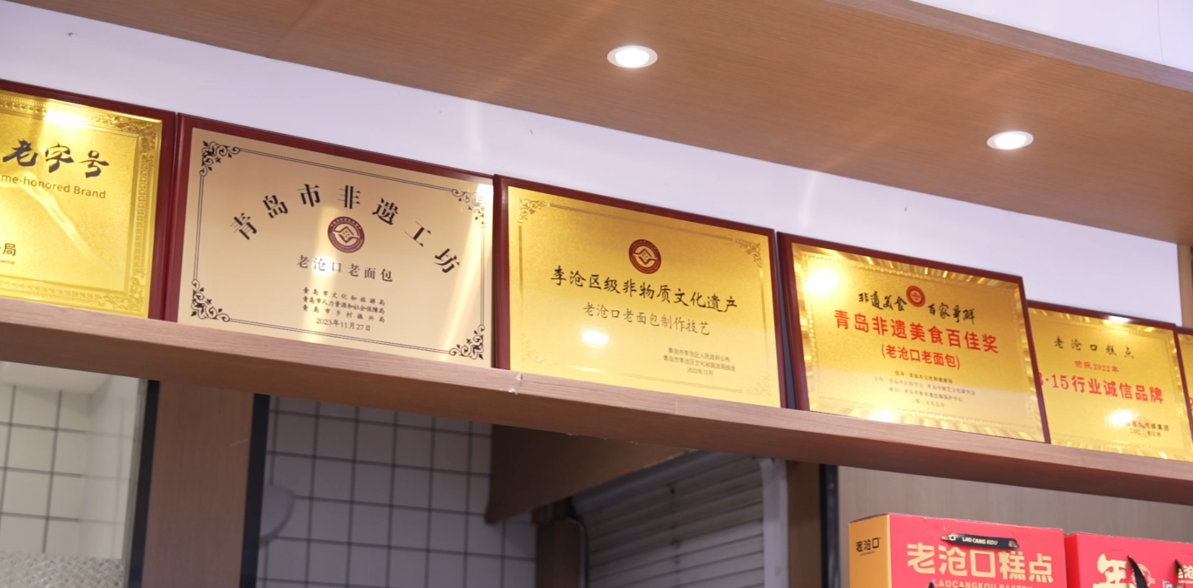 这份坚守获得了时代的认可,2022年,“老沧口老面包制作技艺”“老沧口蜜三刀制作技艺”入选李沧区非物质文化遗产代表性项目;2025年,老面包制作技艺更升格为市级非遗。2023年,企业获评青岛市非遗工坊,2024年荣获“青岛老字号”称号。