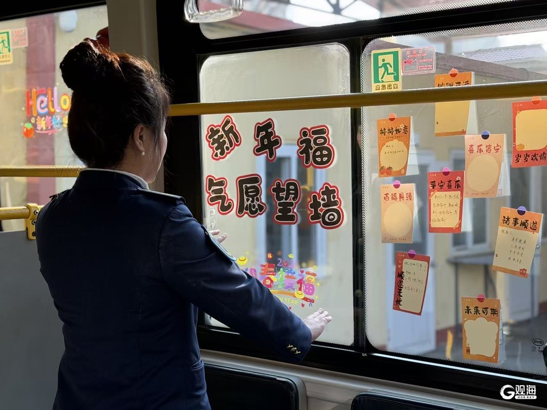 走进946路“元旦祈福巴士”,彩色“新年快乐”窗花点缀车窗,喜庆氛围扑面而来。车厢内的“新年福气愿望墙”成为热门打卡点,便签纸与笔整齐摆放,乘客纷纷驻足写下心愿——有对家人平安健康的祝福,有对工作顺利的期许,也有对孩子学业进步的期盼,一张张便签串联起双向奔赴的温暖。驾驶员化身“暖心使者”,用热情的节日问候迎接每一位乘客,让车厢暖意融融。