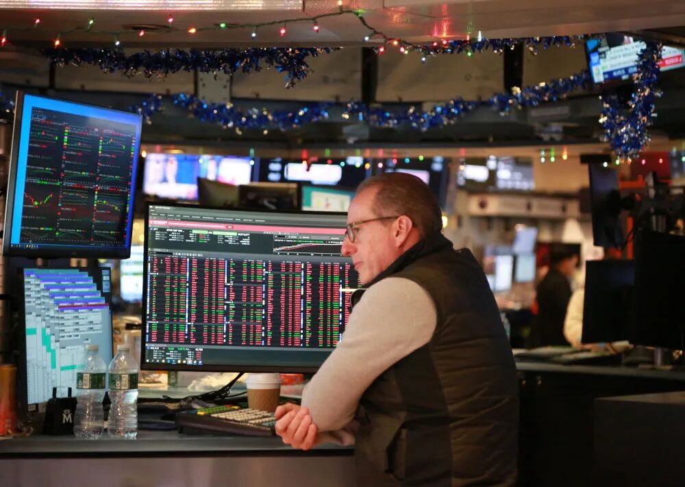 2025年12月12日,一名交易员在美国纽约证券交易所交易大厅内工作。纽约股市三大股指当日下跌。新华社记者 刘亚南 摄